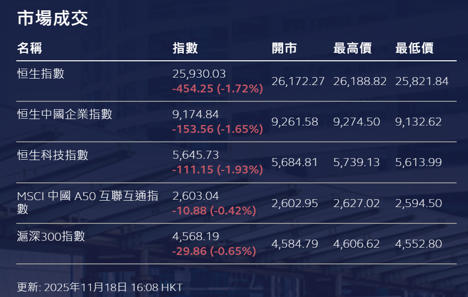 香港文匯報訊 美國經濟不確定性高企及AI高估值憂慮升溫,拖累環球投資氣氛,亞太區股市普遍受壓。港股三大指數亦見捱沽,恒指跌454點或1.72%;國企指數跌1.65%;恒生科技指數跌1.93%。大市成交略升至2,421億元水平。