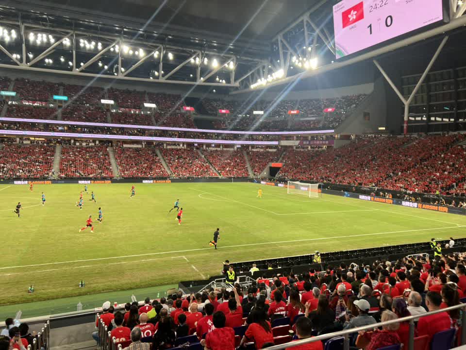 大量觀眾入場觀賽,紅衫港隊主場出擊,球場亦掛起代表「爆滿」的紅旗。