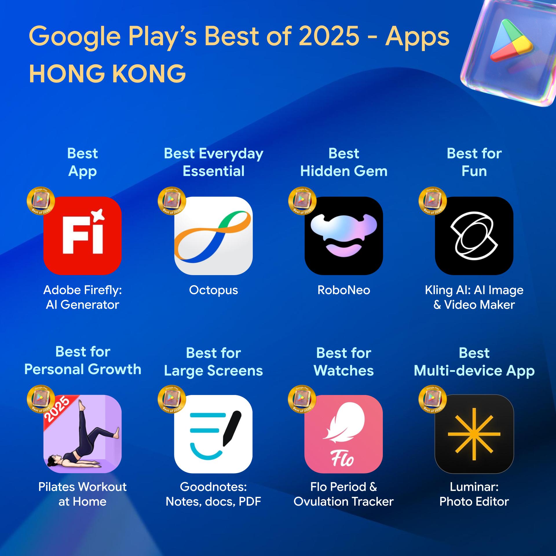 Google Play應用程式及遊戲策略夥伴經理陳曉瑩表示,Google Play一直致力為用戶構建一個安全可靠的平台,並為開發者提供先進的工具與資源,協助他們在全球開拓新市場。今年共有17款得獎作品(見下圖),涵蓋8款應用程式和9款遊戲。除《八達通》榮獲「年度最佳生活幫手應用程式」外,《RoboNeo》獲選為香港「年度最具潛力應用程式」。