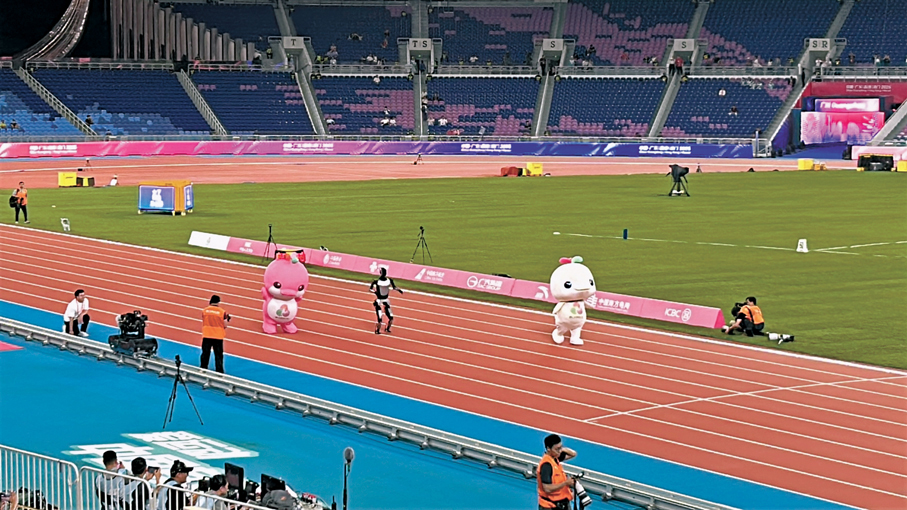 香港文匯報記者了解到,這款人形機器人還在十五運會開幕式上,通過敲擊青銅勾鑃(盛行於春秋戰國時期吳越地區的打擊樂器,編者註)完成了一場「古今對話」表演,並在11月14日十五運會拳擊項目用於輔助頒獎,於11月5日和8日在主媒體中心用於迎賓禮儀。雖然這次比賽以展示為主,但相信在不遠的未來,機器人將會參與真人百米賽跑。