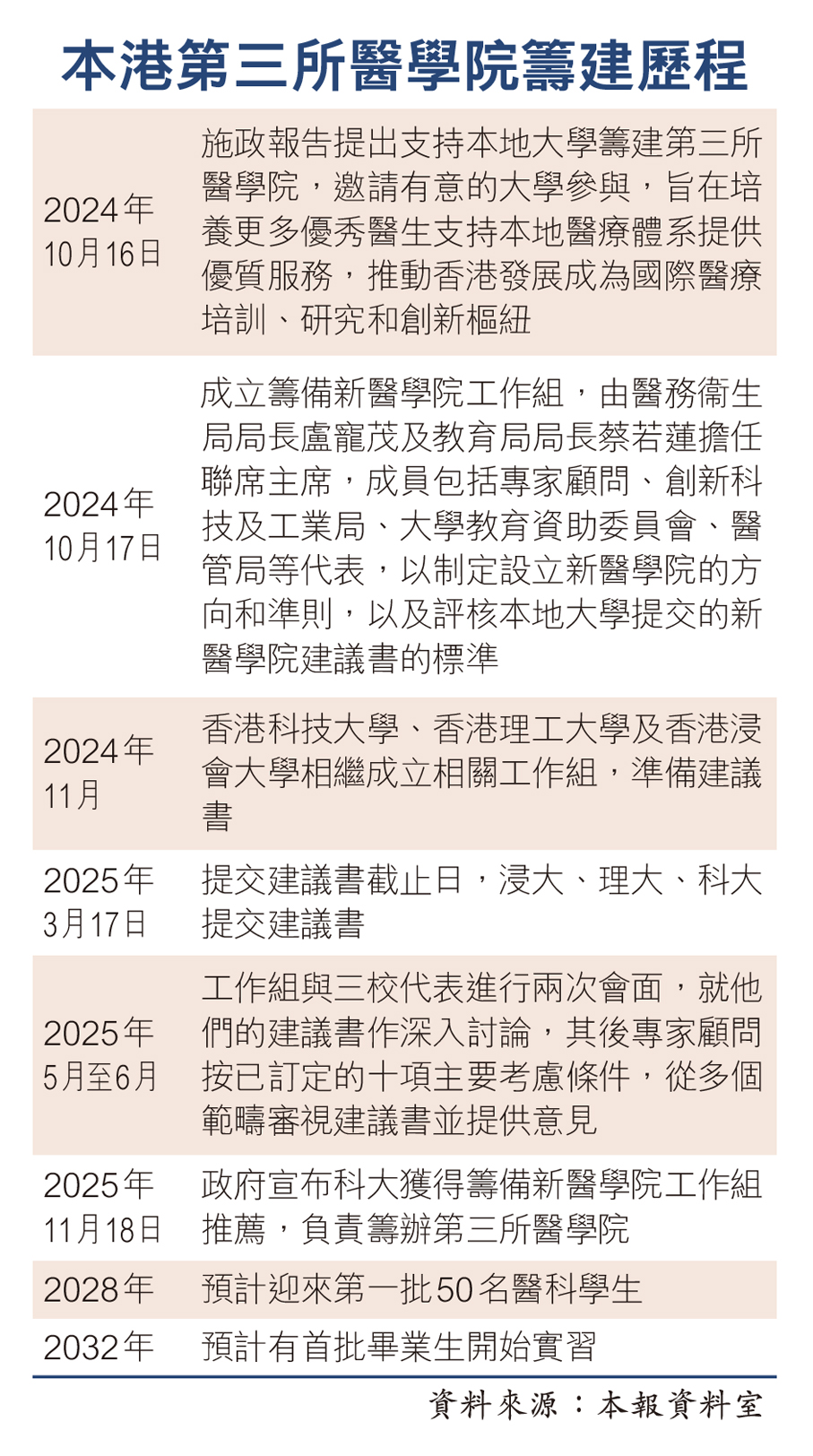 去年施政報告提出支持本地大學籌建第三所醫學院,以培養更多優秀醫生支持本地醫療體系、提供優質服務,並推動香港發展成為國際醫療培訓、研究和創新樞紐。經過一年多的努力,有份負責推動有關事宜的籌備新醫學院工作組聯席主席、醫務衞生局局長盧寵茂昨日宣布,行政長官會同行政會議已通過設立第三所醫學院,並由香港科技大學籌辦。他讚揚科大計劃書策略定位清晰,具備全球視野,學術與科研實力兼備,且財力雄厚,可以配對形式籌建及營運,未來25年科大與政府出資相若,比例約為一比一。政府預計2028年可錄取第一屆50名學生,2032年將有首批畢業生開始實習;科大將於今日舉行記者會介紹詳情。