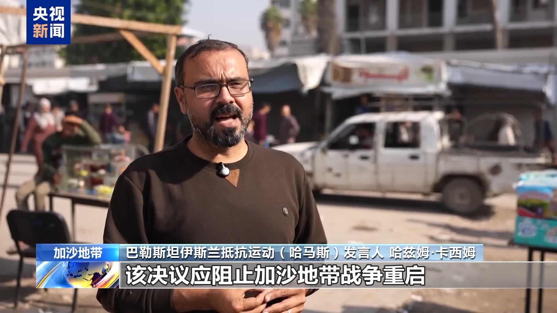 巴勒斯坦伊斯蘭抵抗運動(哈馬斯)發言人 哈茲姆·卡西姆:我們需要的是一項安理會決議,該決議應阻止加沙地帶戰爭重啟,允許援助進入加沙並開啟政治進程,促成獨立巴勒斯坦國的建立。