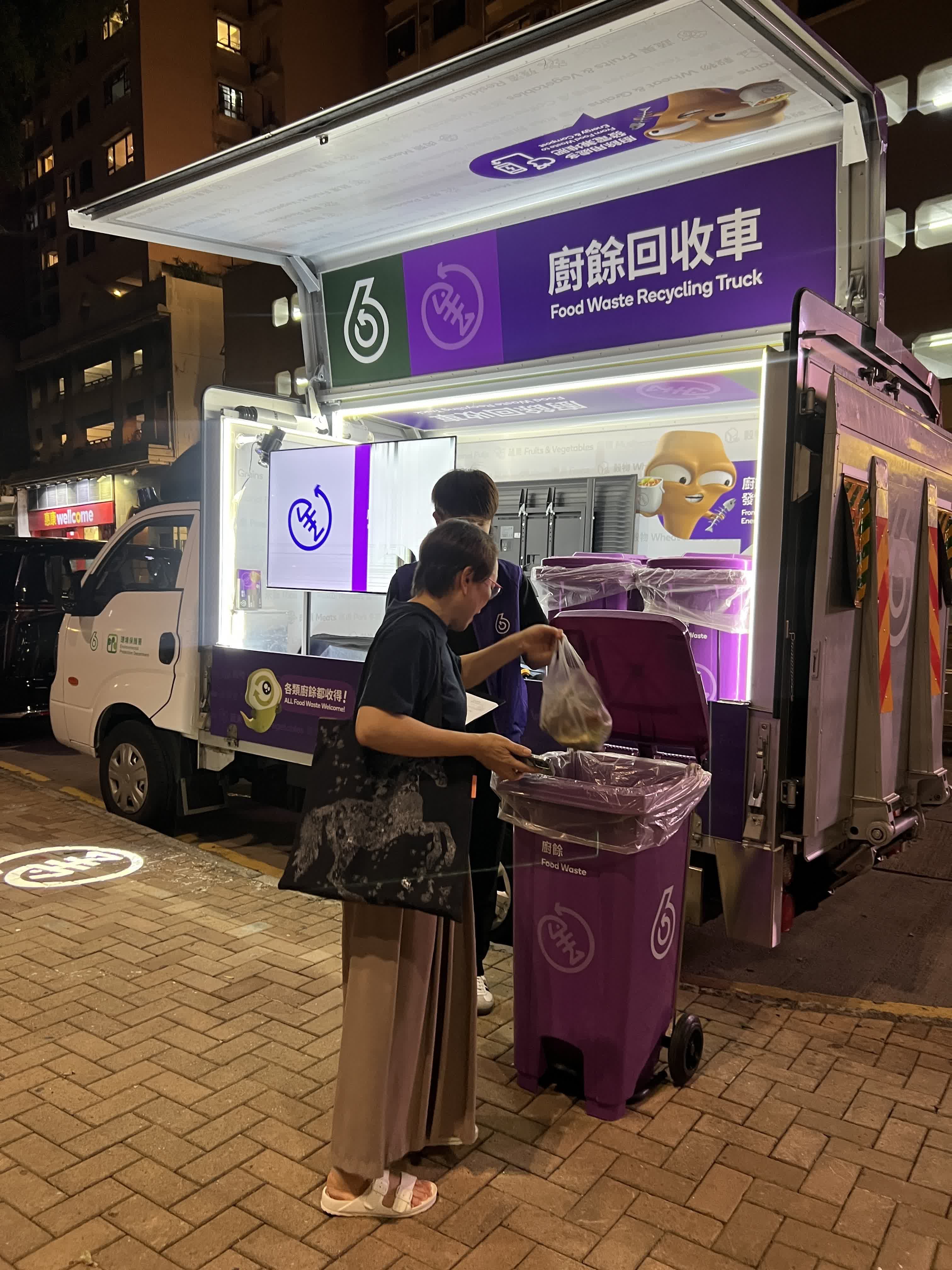 現時已有超過1,500個設於公共屋邨、私人屋苑等地點的家居廚餘回收設施。環保署去年在全港各區逐步設立約250個公眾廚餘回收點,當中在夜間營運的「廚餘回收流動點」,可為繁忙都市中的居民提供便捷的廚餘回收途徑。廚餘回收量近年持續上升。整體廚餘回收量已達至每日340公噸,較2023年增長一倍,當中家居廚餘回收量由2023年每日7公噸大幅增至現時約130公噸。
