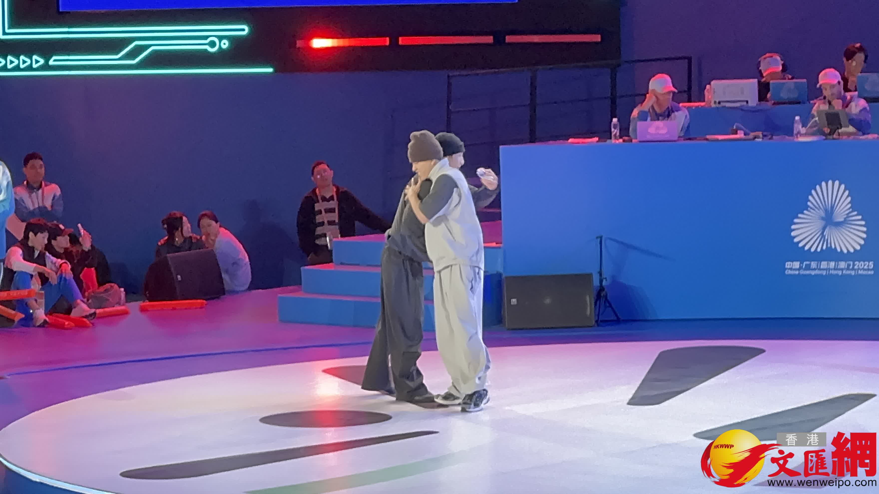 (香港文匯網記者盧靜怡 廣州報道)19日,十五運會霹靂舞男子組決賽在廣州舉行,現場罕見上演霹靂舞版「香港德比」。霹靂舞男子組比賽中,選手曾子驊、施嘉鑫代表香港出戰。該項目比賽以鬥舞環節最為刺激,不同組別的選手一對一同台競技,隨着節奏做個各種高難度動作。對戰中,港隊曾子驊與施嘉鑫同場比賽互相PK,十分精彩。