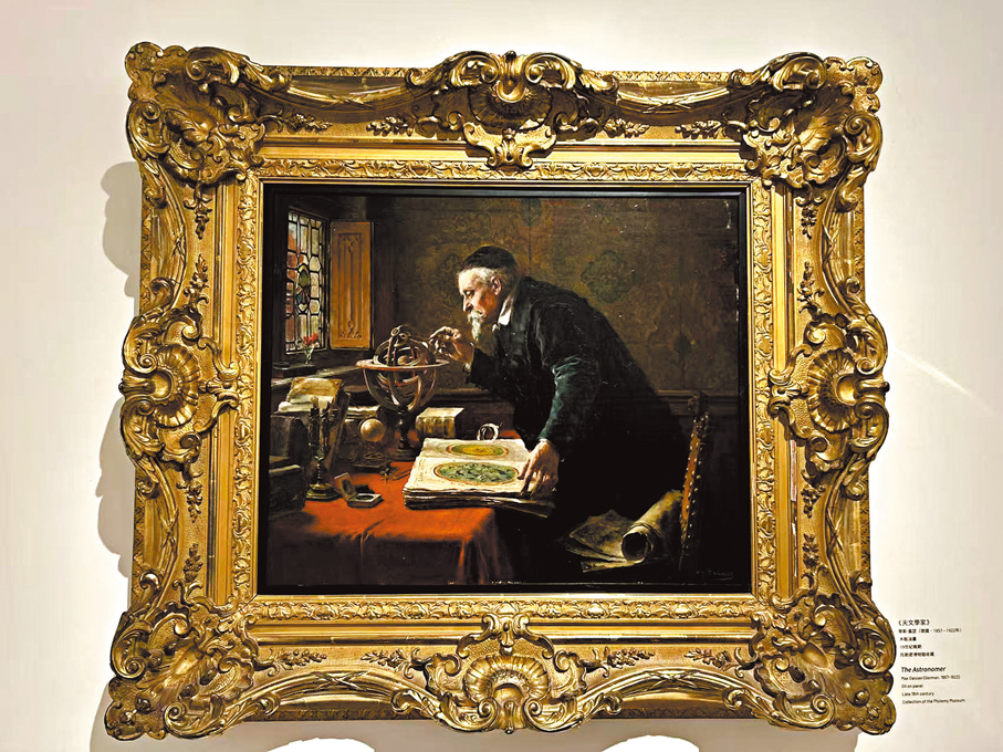 除了科學概念上的呈現,還有石版畫《月面圖》,由比爾和馬德勒創作,是第一張精確的大比例尺月球地圖,被稱為史上最精美的石印月球地圖。同時,亦有油畫《天文學家》,慕尼克畫派代表藝術家蓋瑟以豐富的細節描繪白髮蒼蒼的天文學家在窗前對照渾天儀和天圖,以藝術記錄了歷史上的科學瞬間。