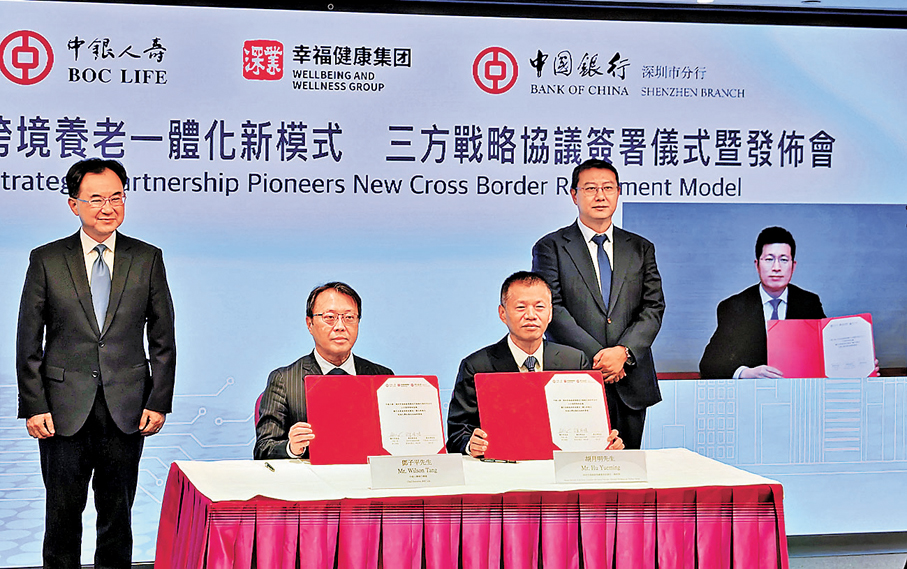 香港文匯報訊(記者 黃安琪)為響應國家養老金融政策及粵港澳大灣區融合發展,中銀人壽、深業集團旗下深圳幸福健康集團與中國銀行深圳市分行昨日簽署戰略合作框架協議,共同打造創新的「金融+康養」跨境養老綜合解決方案,助力大灣區居民實現「老有所養、老有所樂、老有所安」的幸福晚年。是次合作聚焦三大核心領域:一站式個人跨境金融服務、全周期專業跨境養老服務、全面連接銀髮經濟領域。