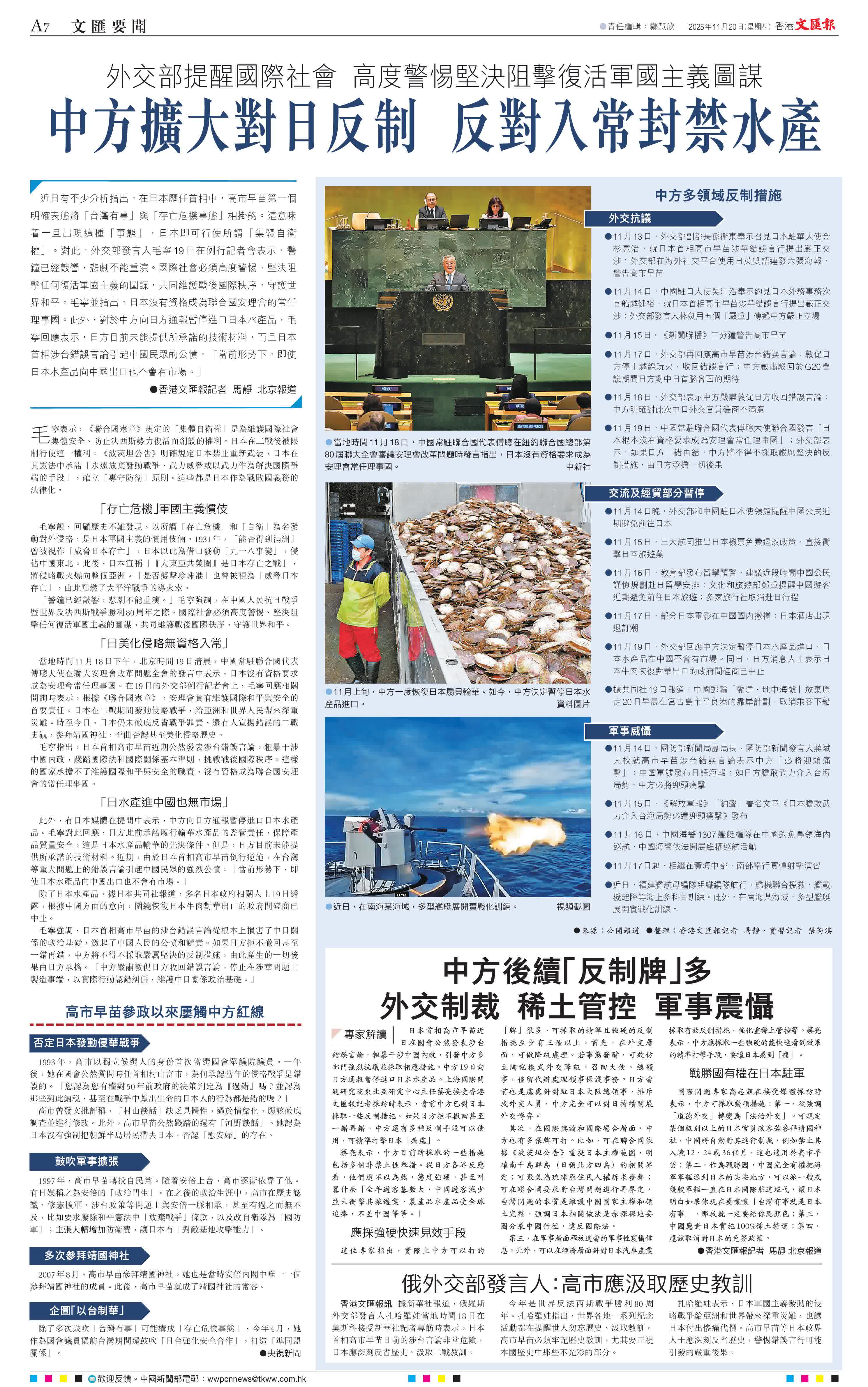 (香港文匯報記者 馬靜 北京報道)近日有不少分析指出,在日本歷任首相中,高市早苗第一個明確表態將「台灣有事」與「存亡危機事態」相掛鈎。這意味着一旦出現這種「事態」,日本即可行使所謂「集體自衛權」。對此,外交部發言人毛寧19日在例行記者會表示,警鐘已經敲響,悲劇不能重演。國際社會必須高度警惕,堅決阻擊任何復活軍國主義的圖謀,共同維護戰後國際秩序,守護世界和平。毛寧並指出,日本沒有資格成為聯合國安理會的常任理事國。此外,對於中方向日方通報暫停進口日本水產品,毛寧回應表示,日方目前未能提供所承諾的技術材料,而且日本首相涉台錯誤言論引起中國民眾的公憤,「當前形勢下,即使日本水產品向中國出口也不會有市場。」