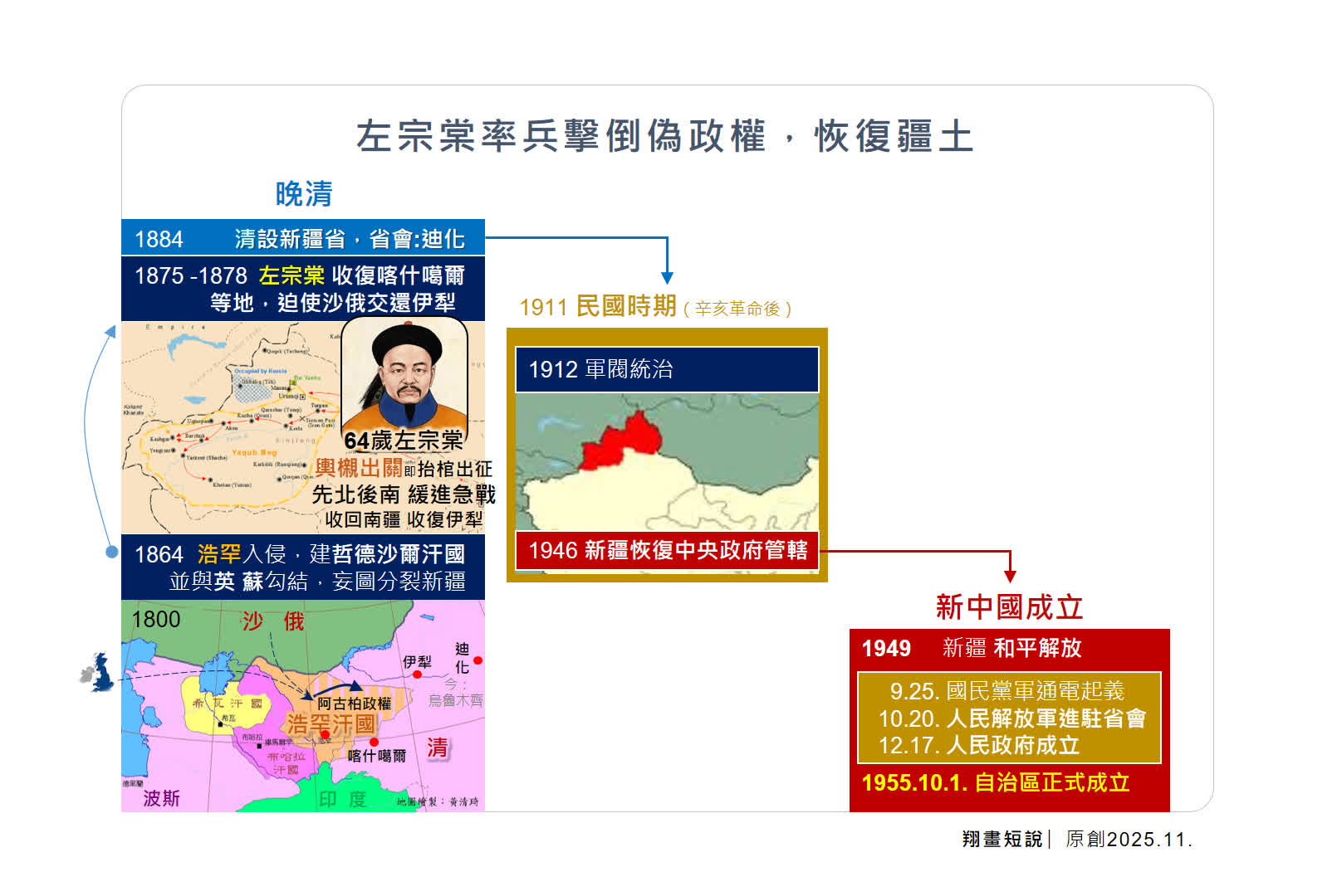 1876 年,欽差大臣左宗棠以「抬棺西徵」的決心,率清軍入疆平叛。一年多後收復除伊犁外的新疆全境,阿古柏政權覆滅。經艱苦外交談判,1881 年《中俄改訂條約》迫使沙俄歸還伊犁(但仍割佔霍爾果斯河以西地區)。1884 年,清政府正式設立新疆省,將其納入國家行政體系。