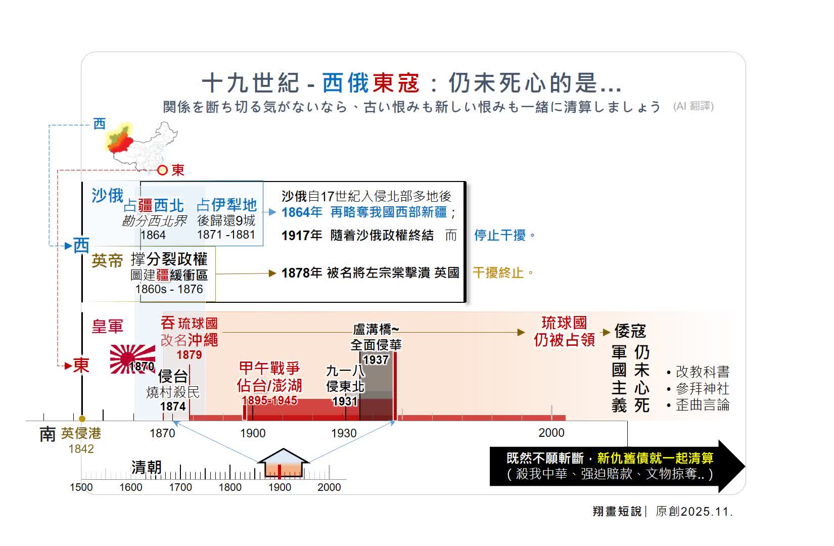 遊訪國泰民安的新疆,勾起對十九世紀被欺凌近代史的回憶。縱觀西北邊疆與東面海疆,一些侵略痕跡已成歷史陳跡,惟另有一部分卻仍居心不良。