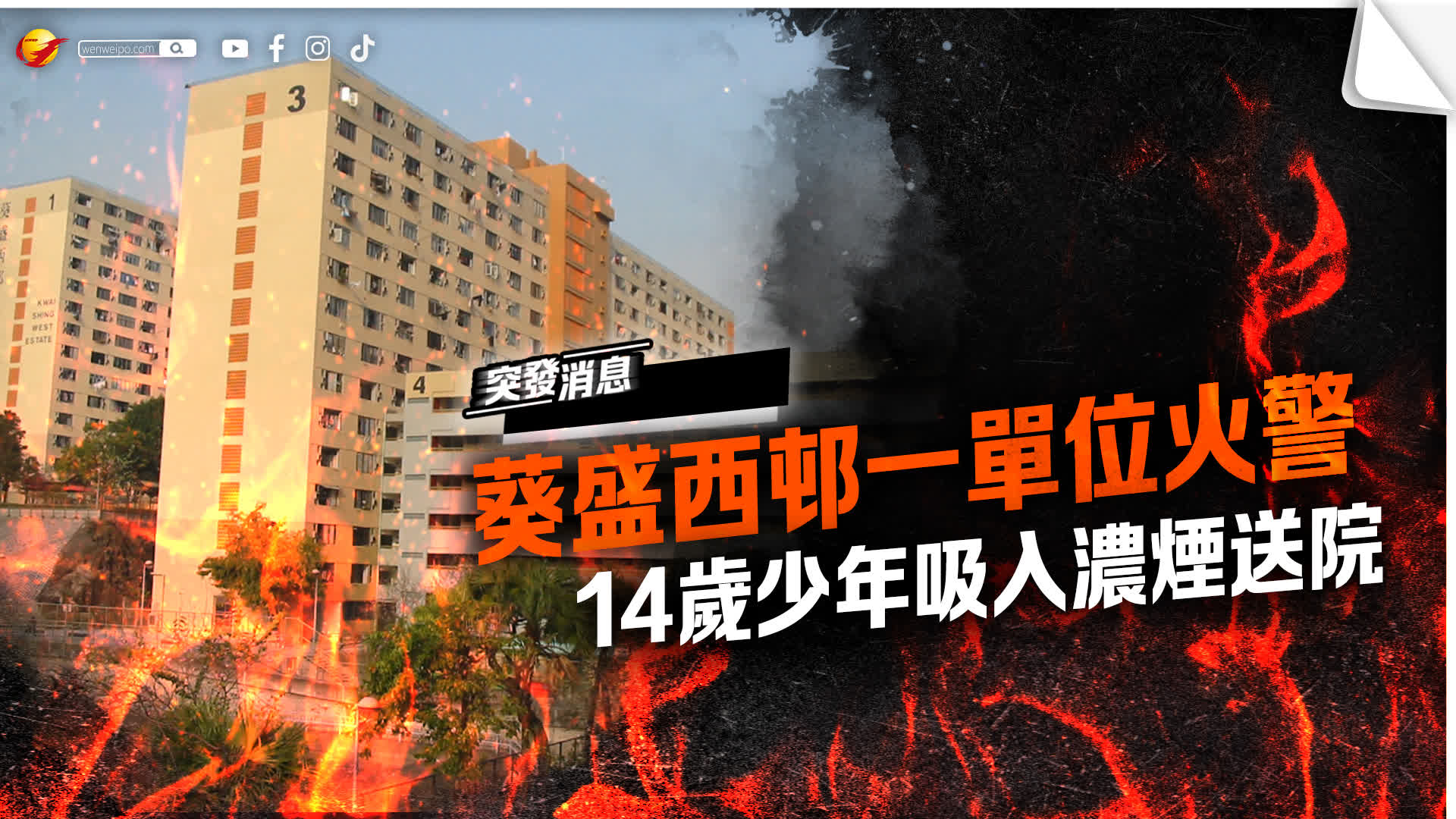 今日(20日)早晨7時41分,葵涌葵盛西邨8座3樓一單位冒出濃煙,多名街坊報案。消防人員趕抵現場,出動一條喉及一隊煙帽隊灌救,並在單位內救出一名14歲少年,至早上8時05分將火救熄。現場所見,起火單位窗戶及外牆被大火熏黑。