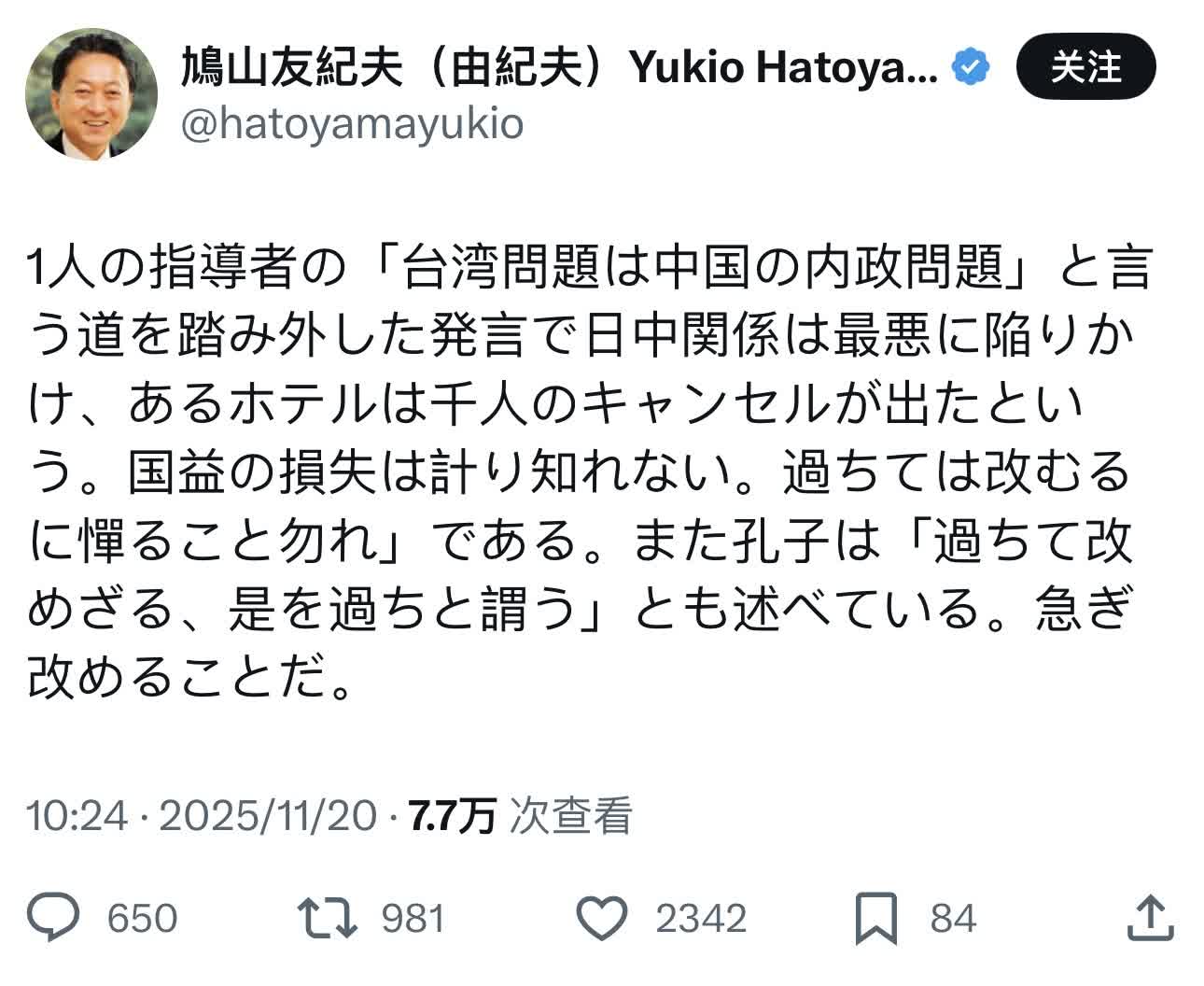 就近期日本首相高市早苗涉台錯誤言論,日本前首相鳩山由紀夫當地時間20日再次發文:「因為一名領導人發表了偏離『台灣問題是中國內政』這一正道的言論,日中關係幾乎陷入最惡劣的境地,據說有一家酒店出現一千人取消預訂的情況。國家利益的損失無法估量。」