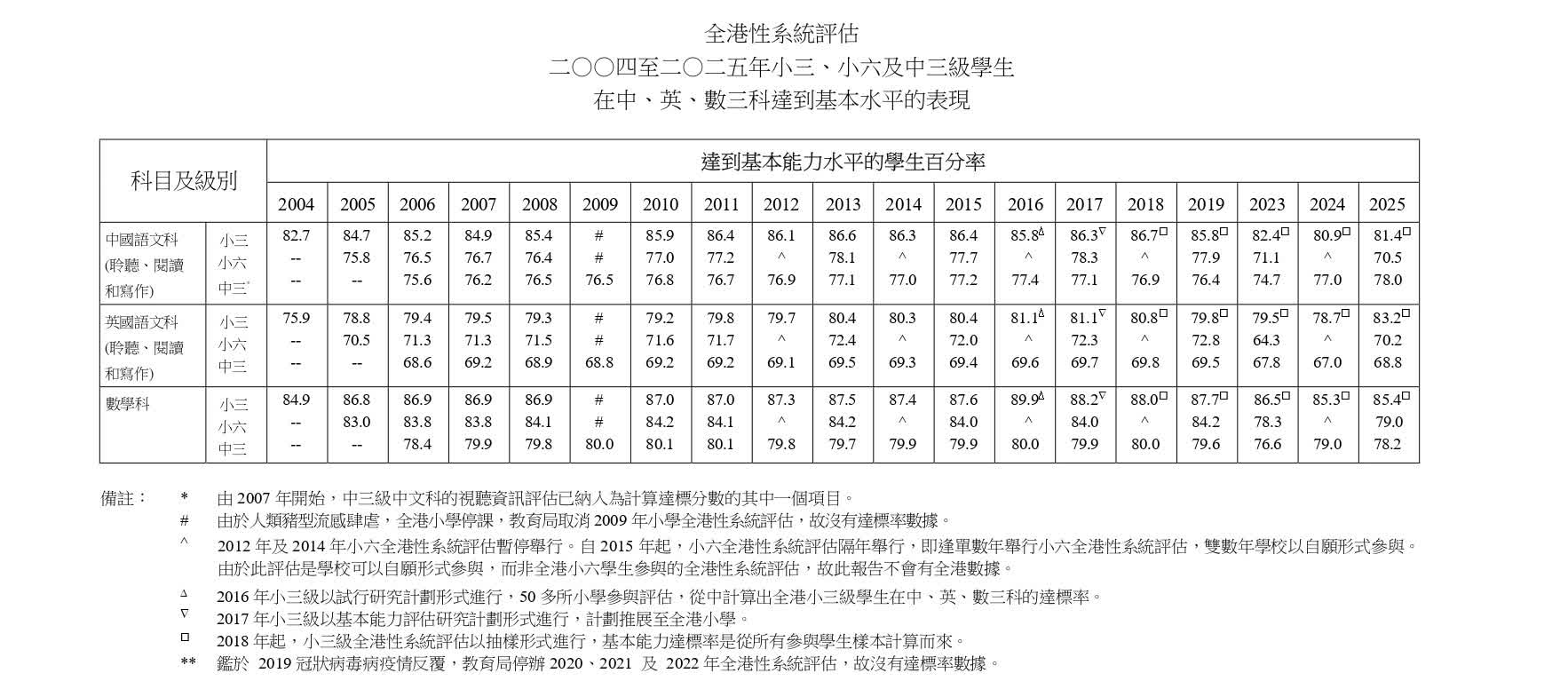 2004至2025年系統評估學生表現數據載於附件,系統評估詳情載於考評局網頁(www.bca.hkeaa.edu.hk)。