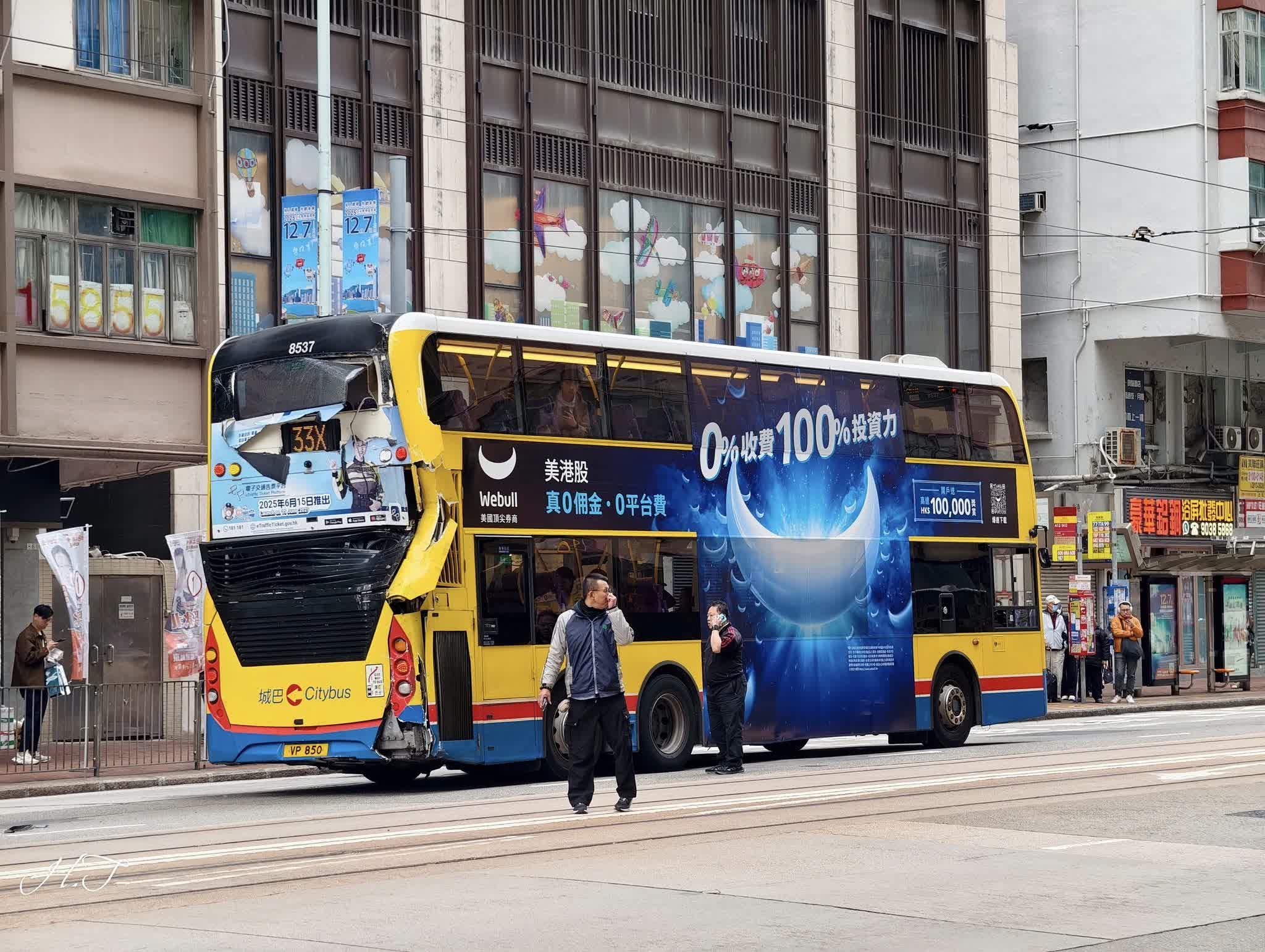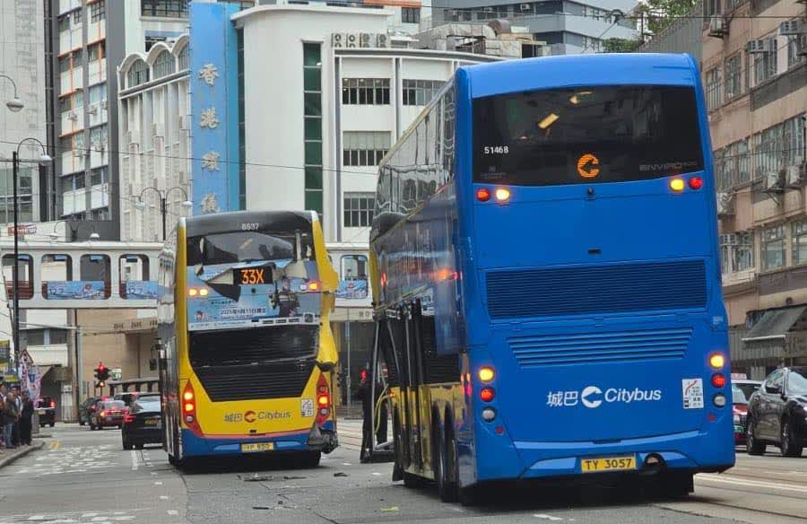 城巴發言人表示,周四(11月20日)上午約9時半,城巴一輛往數碼港方向的33X號線巴士,於英皇道近民新街涉及一宗交通事故,兩名乘客受輕傷毋須送院治理,車長受輕傷。事故同時涉及一輛非載客巴士。城巴會配合警方調查。