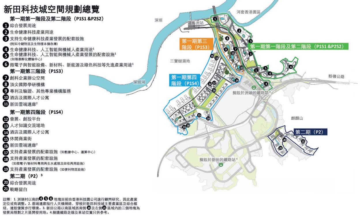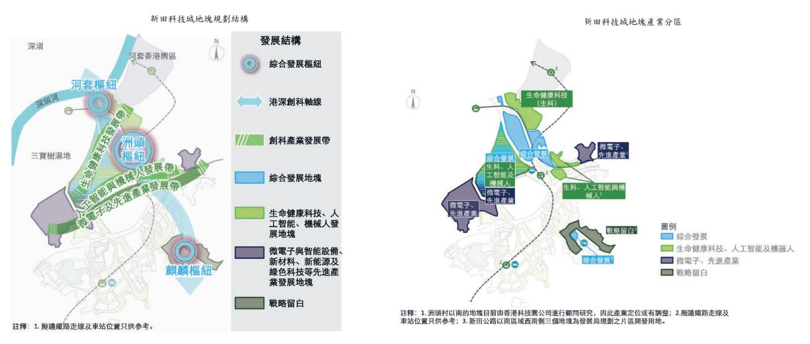 就用地布局而言,新田科技城的新創科用地會以三個樞紐、三個產業發展帶(三紐、三帶)劃分和發展,即由北至南的河套樞紐、洲頭樞紐及麒麟樞紐,以及生命健康科技發展帶、人工智能與機械人發展帶及微電子與先進產業發展帶。此規劃結構結合創科產業布局節奏和相關收地和工務部門土地平整工程時間表,劃分為五個發展階段,從導入、產業生態延展、產城中樞,以至完善階段。