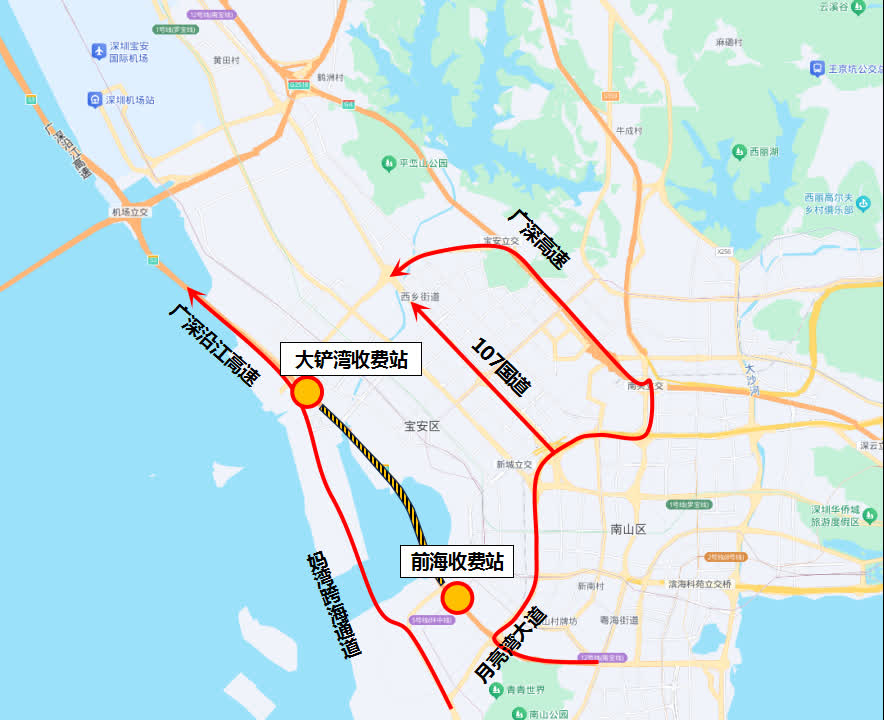 從深圳灣片區出發的,可改沿月亮灣大道經107國道或轉廣深高速繞行。