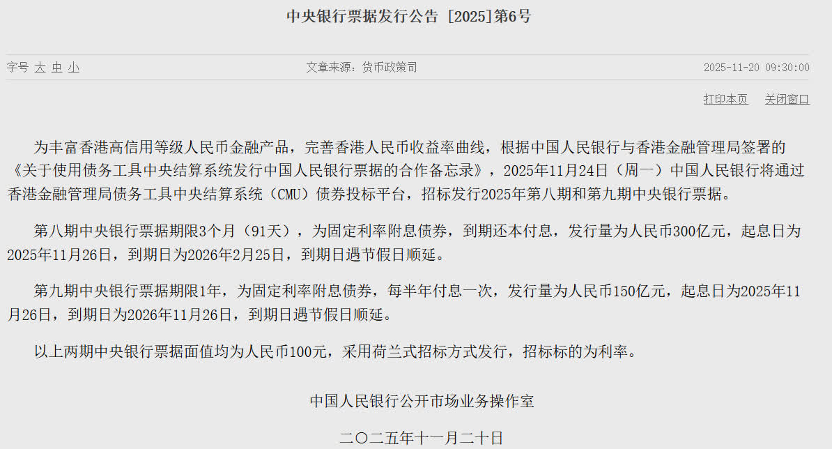 香港文匯報訊 中國人民銀行公布,2025年11月24日(下周一)將通過香港金融管理局債務工具中央結算系統(CMU)債券投標平台,招標發行今年第8期和第9期中央銀行票據。兩期中央銀行票據發行量共450億元(人民幣,下同)。