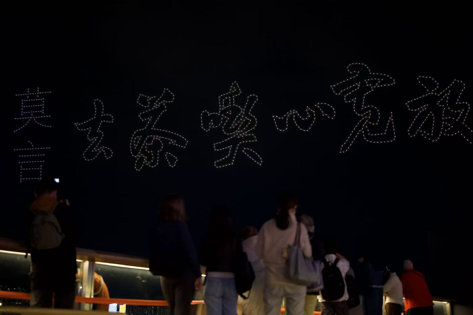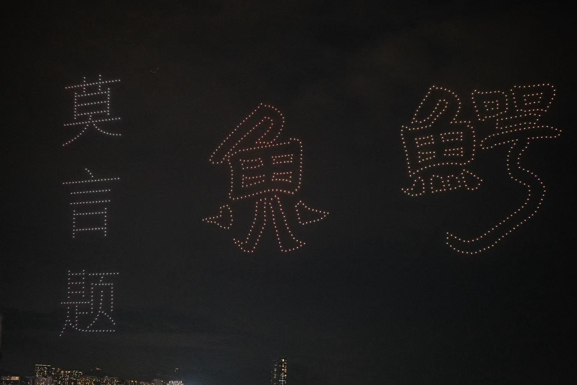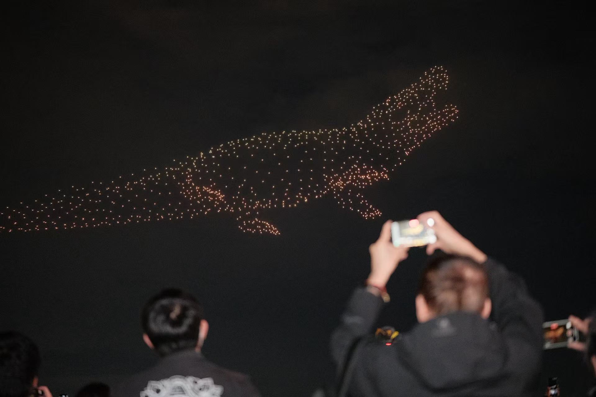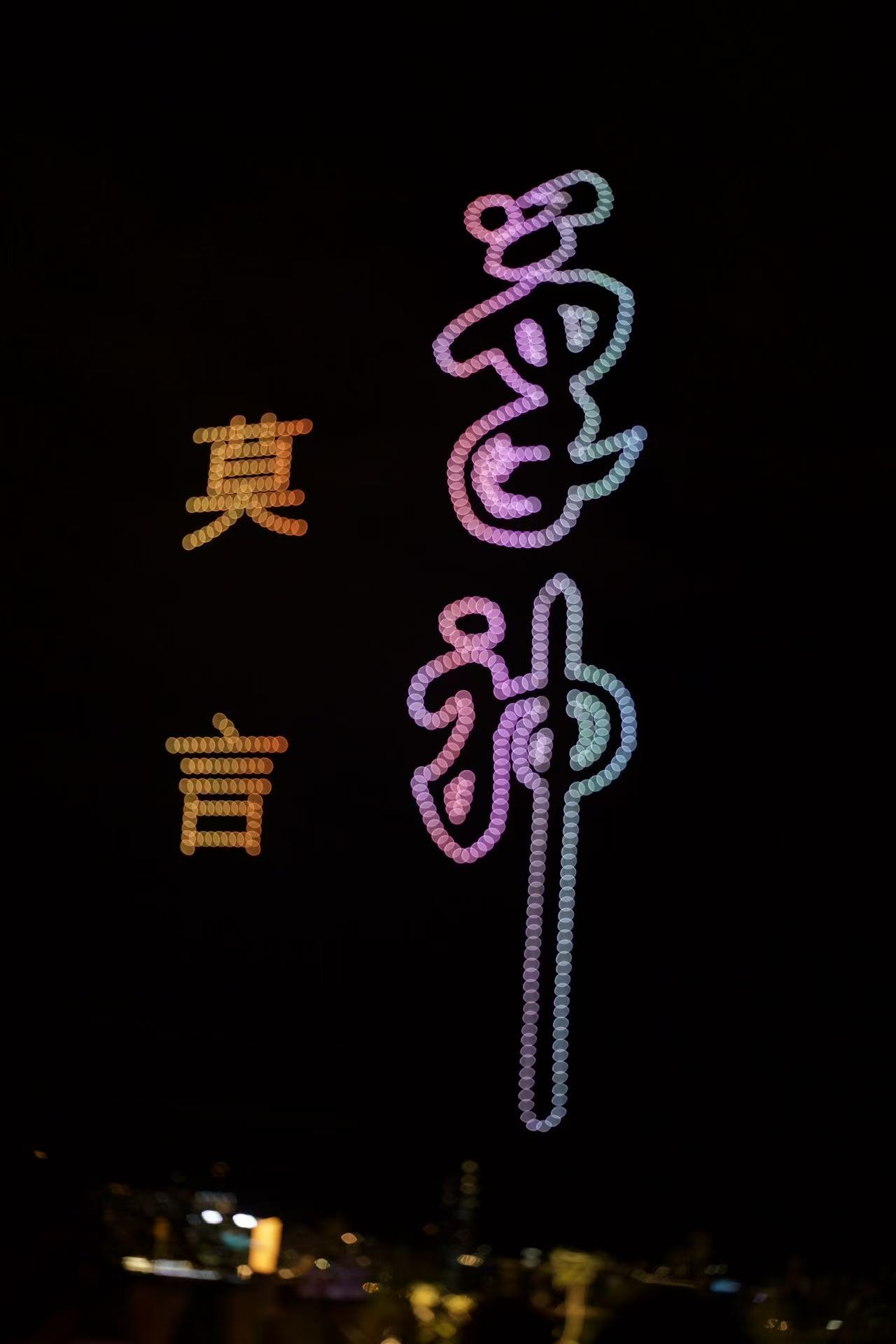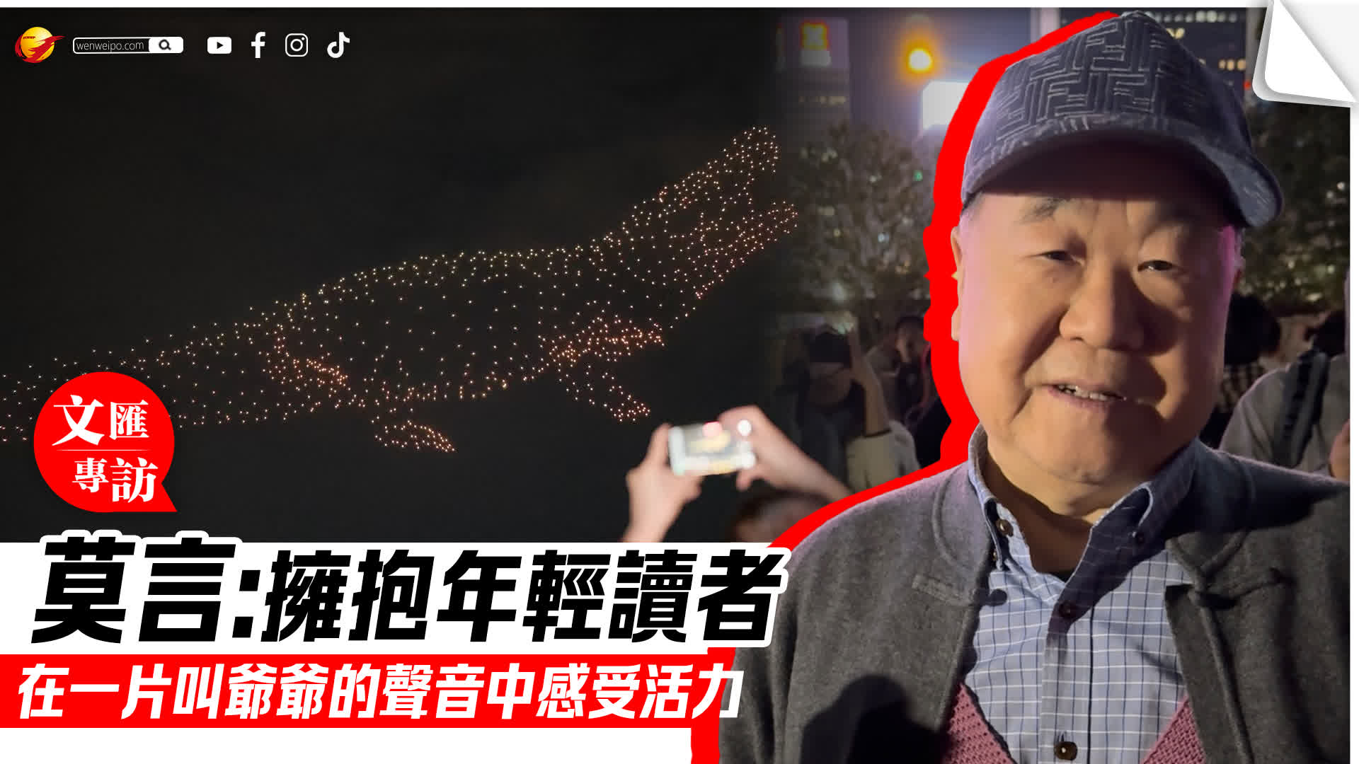 當晚夜空中無人機不斷變換陣型,將鱷魚幻化成中國龍的圖樣,更有不少圖案融合了莫言與王振兩人的親筆書法字樣,十分震撼。表演結束後,莫言先生在接受採訪時,分享了首次觀看無人機表演的震撼體驗,並就香港與內地文化交流、文學戲劇創作、以及與年輕讀者的互動等話題,進行了深入而精彩的闡述。