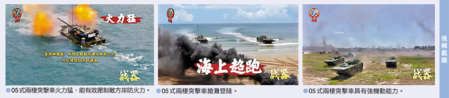 宋忠平指出,05式兩棲裝甲車是中國專門為兩棲登陸作戰研製的一系列裝備,05式裝甲車有多款不同類型的兩棲車輛,遂行不同任務,兩棲突擊車只是其中一種。05式兩棲裝甲車依靠其行進速度、強大的火力和支援能力,可以實現快速搶佔灘頭陣地,為後續的裝備、人員上岸創造條件。整個過程,05式兩棲車族將各自發揮其優勢能力,共同履行「踹門」任務。「比如,突擊車依靠105毫米主炮進行主要目標的定點打擊、火力壓制;步戰車依靠反坦克導彈、煙霧彈進行戰場支援和兵力投送等任務;指揮車可以依靠數據處理能力指揮火力打擊、分配車輛任務等。」