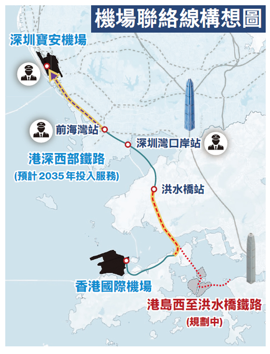 團結香港基金《以鐵為脈 連通灣區:鞏固香港國際航空樞紐地位》研究報告建議,延伸港深西部鐵路,構建機場聯絡線連接香港國際機場至國家高鐵網絡。具體方法即延長預計於2035年通車的港深西部鐵路,從規劃中的深圳前海終點站延伸至深圳寶安機場,並將其香港終點站由洪水橋延伸至香港機場。此聯絡線可將港深機場之間的行程壓縮至約40分鐘,遠較目前約需160分鐘的客車直達、約95分鐘的鐵路接駁及約70分鐘的快船服務為短。