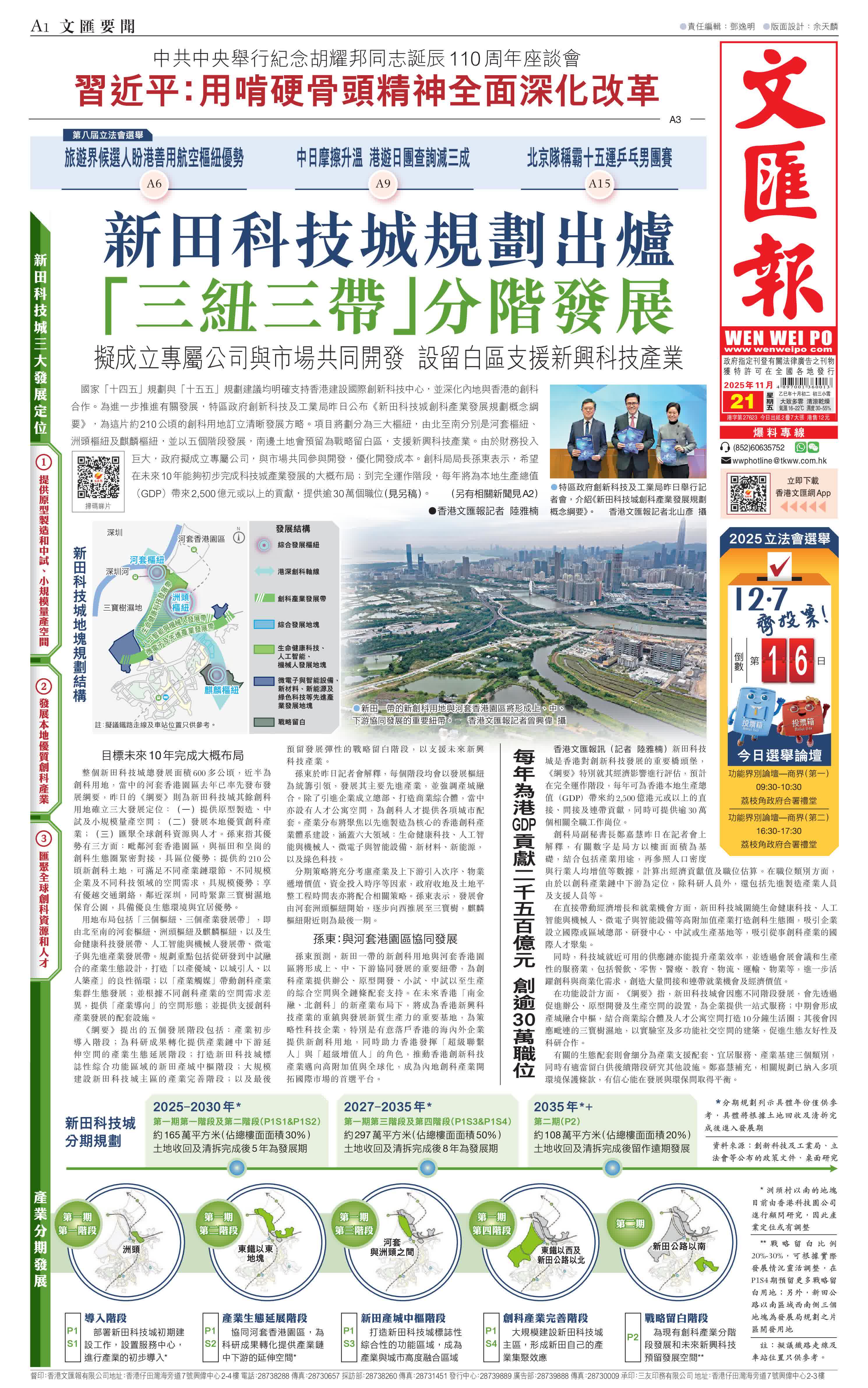 (香港文匯報記者 陸雅楠)國家「十四五」規劃與「十五五」規劃建議均明確支持香港建設國際創新科技中心,並深化內地與香港的創科合作。為進一步推進有關發展,特區政府創新科技及工業局昨日公布《新田科技城創科產業發展規劃概念綱要》,為這片約210公頃的創科用地訂立清晰發展方略。項目將劃分為三大樞紐,由北至南分別是河套樞紐、洲頭樞紐及麒麟樞紐,並以五個階段發展,南邊土地會預留為戰略留白區,支援新興科技產業。由於財務投入巨大,政府擬成立專屬公司,與市場共同參與開發,優化開發成本。創科局局長孫東表示,希望在未來10年能夠初步完成科技城產業發展的大概布局;到完全運作階段,每年將為本地生產總值(GDP)帶來2,500億元或以上的貢獻,提供逾30萬個職位。