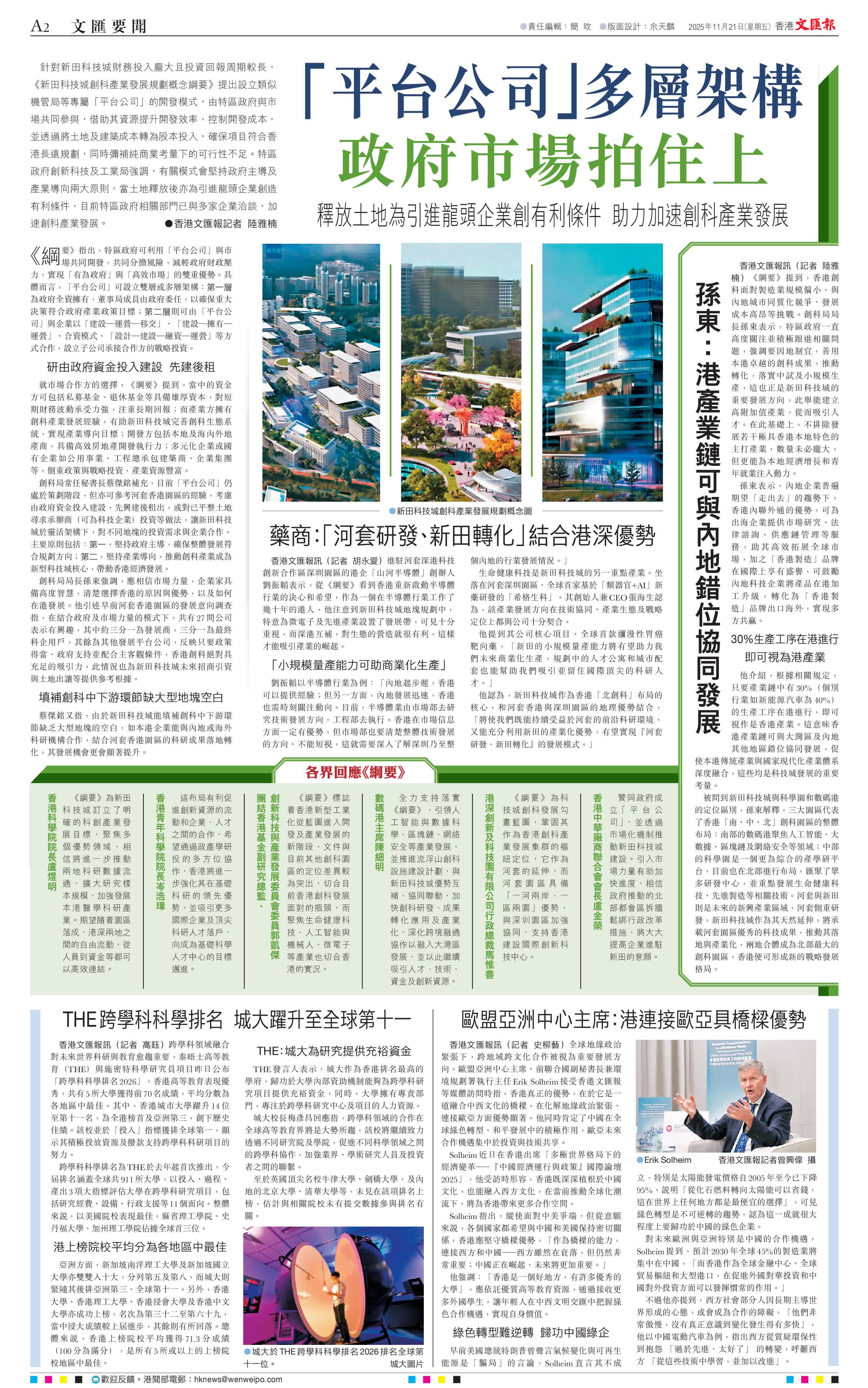 他認為,新田科技城作為香港「北創科」布局的核心,和河套香港與深圳園區的地理優勢結合,「將使我們既能持續受益於河套的前沿科研環境,又能充分利用新田的產業化優勢,有望實現『河套研發、新田轉化』的發展模式。」