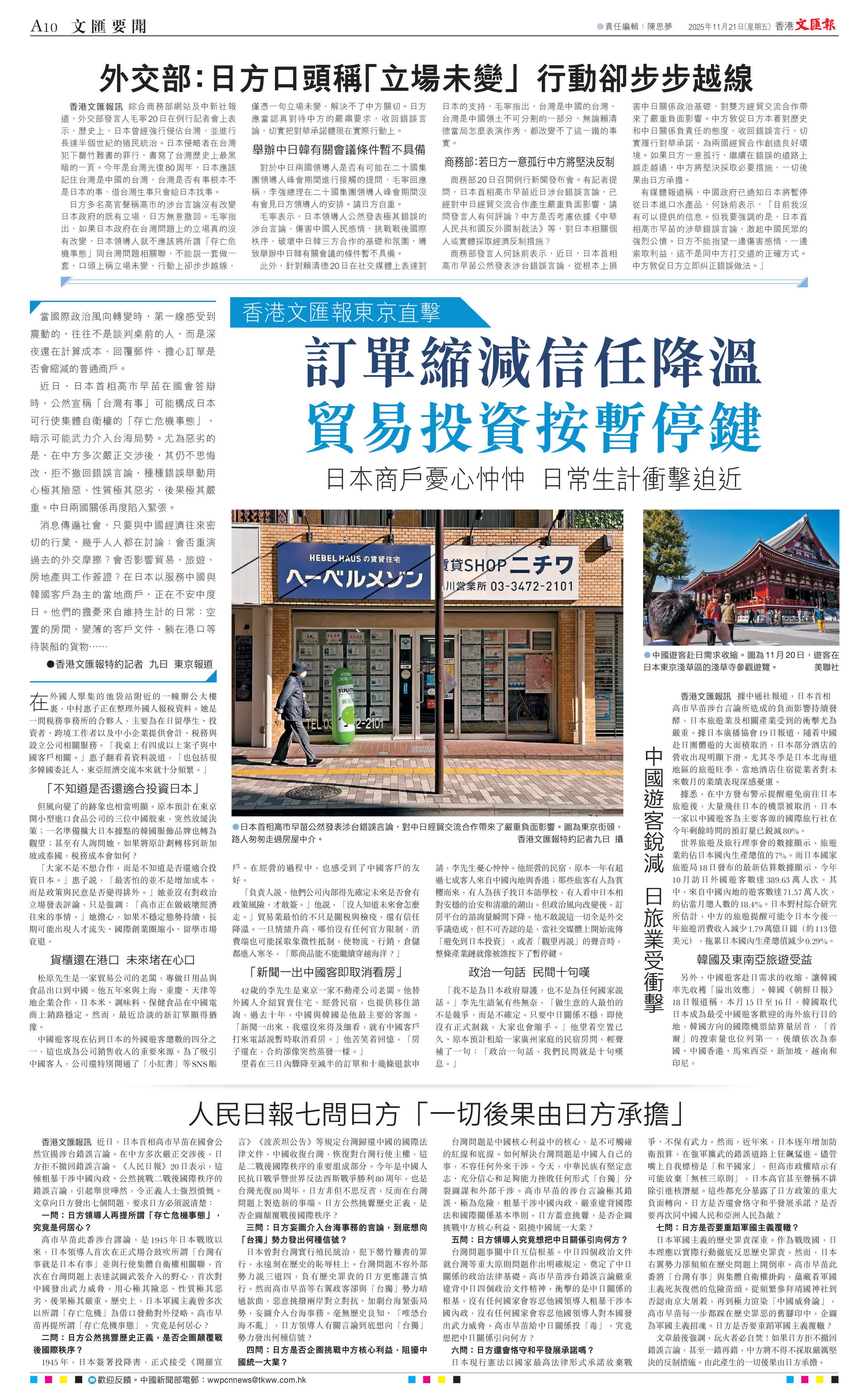 消息傳遍社會,只要與中國經濟往來密切的行業,幾乎人人都在討論:會否重演過去的外交摩擦?會否影響貿易、旅遊、房地產與工作簽證?在日本以服務中國與韓國客戶為主的當地商戶,正在不安中度日。他們的擔憂來自維持生計的日常:空置的房間、變薄的客戶文件、躺在港口等待裝船的貨物……