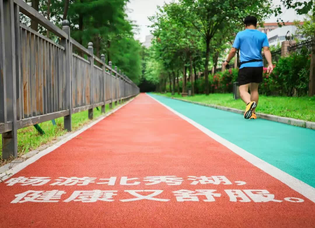 北秀湖打造的長約一公里的專業緩跑徑,巧妙地將湖水的瀲灧波光、蔥蘢綠意與市民的運動熱情串聯起來,在這裏跑步,健康又舒服。