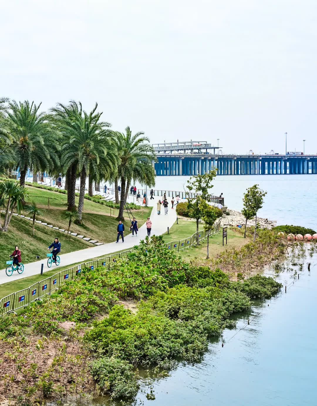 在東莞黃金海岸、苗涌生態長廊,有着寬敞平整的碧道、慢行道,串聯河道與綠地,構成濱水生態綠廊,在這裏同樣可以賞景散步騎行。