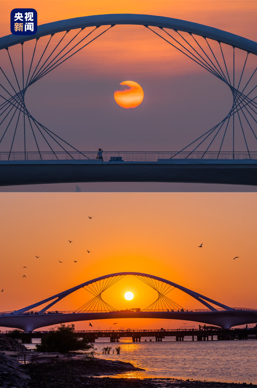 從濱海灣大道往龍湧出海口望去,落日映入橋索間,「灣區之眸」奇妙景觀美如畫卷。