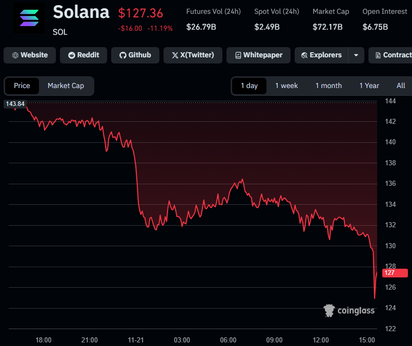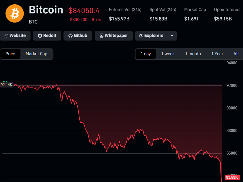 香港文匯報訊(記者 黃安琪) 行情顯示,加密貨幣市場集體暴跌。其中,比特幣24小時最高92349.34美元,現報84,050.4美元,日內降幅達8.7%;以太坊24小時最高3,041.92美元,現報2,716.39美元,日內降幅達10.38%;索拉拉SOL 24小時最高143.72美元,現報127.36美元,日內降幅達11.19%。