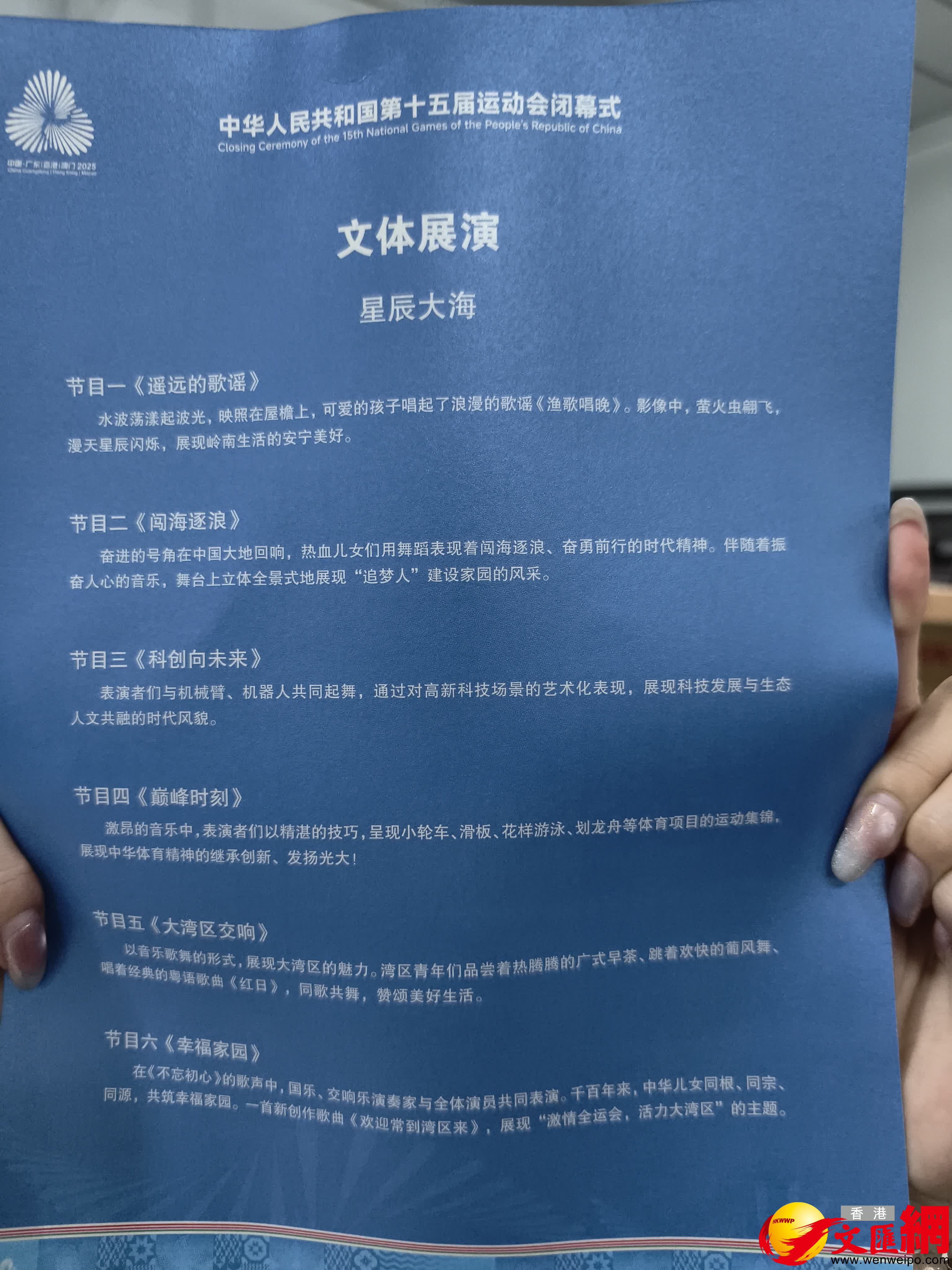 (香港文匯網記者 胡永愛、郭若溪、李薇)11月21日,第十五屆全國運動會將在深圳歡樂劇場舉行閉幕式。這場歷時13天的體育盛會的終章,以「星辰大海」為主題,首次走出封閉場館,在深圳海濱實景上演閉幕盛典,為粵港澳三地聯合承辦的全運會畫上圓滿句號。而即將上演的閉幕式文體展演也安排了滿滿的灣區的誠意和驚喜。