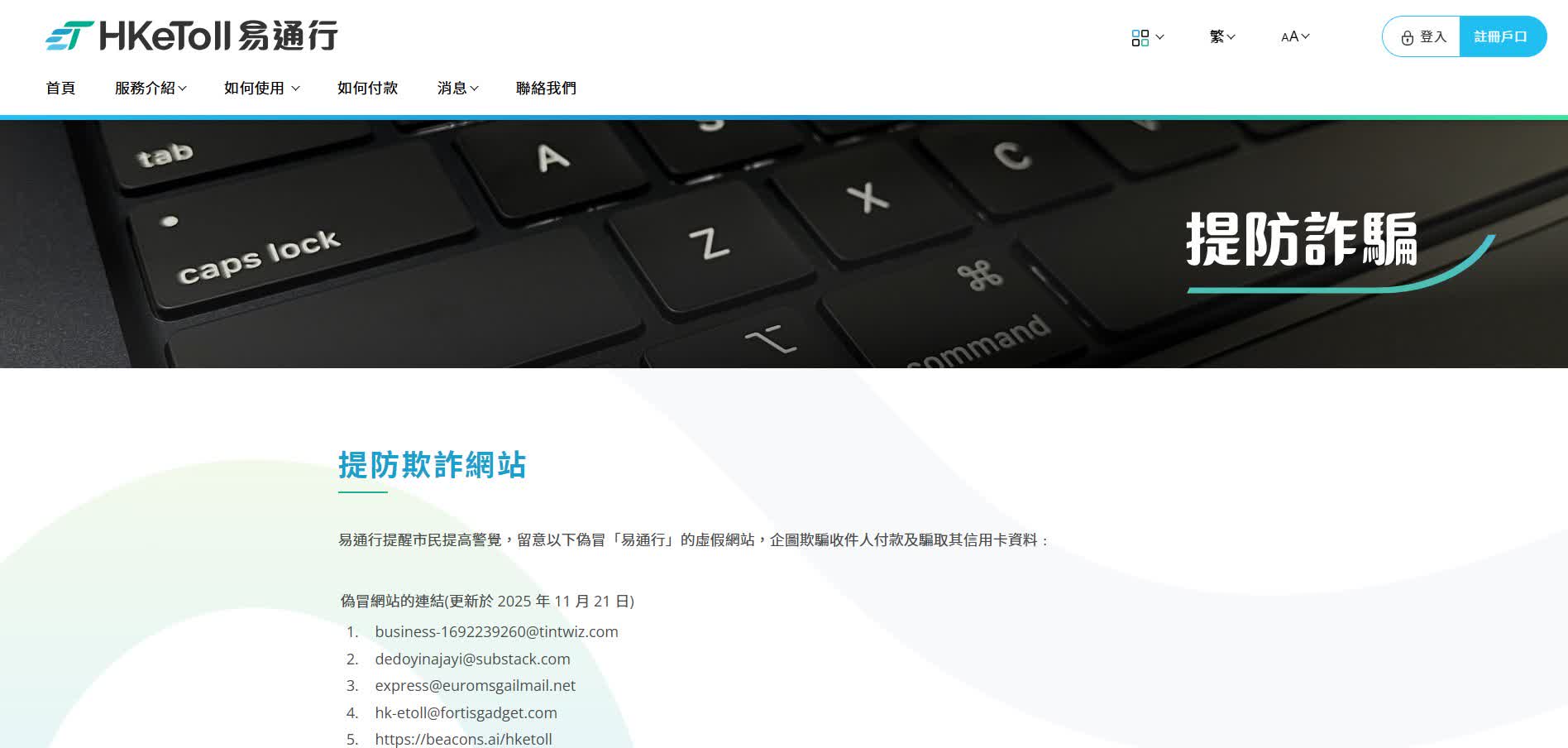 香港文匯報訊(記者 蕭景源)運輸署今日(21日)呼籲市民提高警覺,留意偽冒「易通行」的虛假網站及電郵,企圖欺騙收件人付款及騙取其信用卡資料;詳情見「易通行」網站(https://www.hketoll.gov.hk/Support/Anti-Fraud-Web-List)。運輸署澄清,有關虛假網站及電郵與「易通行」沒有任何關係,已把事件交警方跟進。