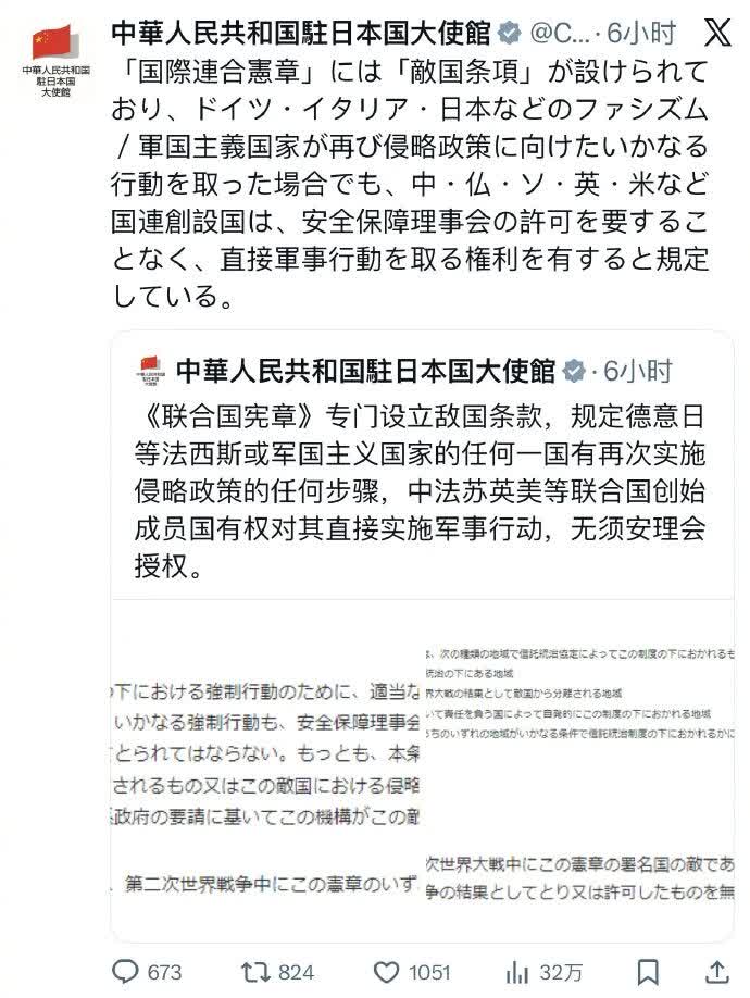 11月21日,中國駐日大使館在社交平台X用中日雙語發帖:
