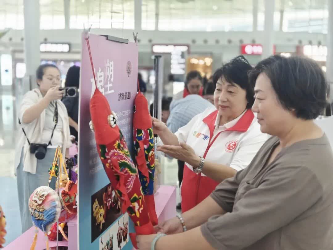 現場展區以「古今共振、動靜結合」為設計理念,設置非遺元素打卡裝置,展示區陳列着棉塑、木刻畫、夏氏燈籠等非遺精品,同時設置了市民非遺手工體驗活動區,成為人氣焦點。棉塑傳承人現場展示「以棉為料、以線為骨」的精湛技藝,將普通棉花經過造型、成胚、縫製、刺繡、繪染、定型等多道工序,逐步塑造成栩栩如生的立體作品。除了棉塑,木刻畫的刀刻神韻、剪紙的玲瓏剔透、夏氏燈籠的精巧奪目,都讓旅客在動手實踐中感受非遺魅力。非遺老師們耐心指導每一位參與者,從工具使用到技法要領,細緻講解中傳遞的不僅是手工技藝,更弘揚和傳承了中華文明之美。