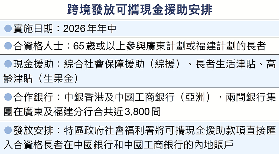 不少香港長者退休後選擇到內地廣東及福建省生活,香港特區政府社會福利署與中銀香港和中國工商銀行(亞洲)昨日簽署合作備忘錄,於明年中推展跨境發放可攜現金援助安排,屆時社署發放的綜援、長者生活津貼及俗稱「生果金」的高齡津貼,可直接由社署匯入有關長者在中國銀行和中國工商銀行的內地賬戶,無須長者自行辦理由香港戶口匯款到內地的程序。勞工及福利局局長孫玉菡表示,社署與兩家銀行首次攜手合作,實現直接跨境發放可攜現金援助,優化現金福利支付模式,為居住內地的香港長者提供更大便利。