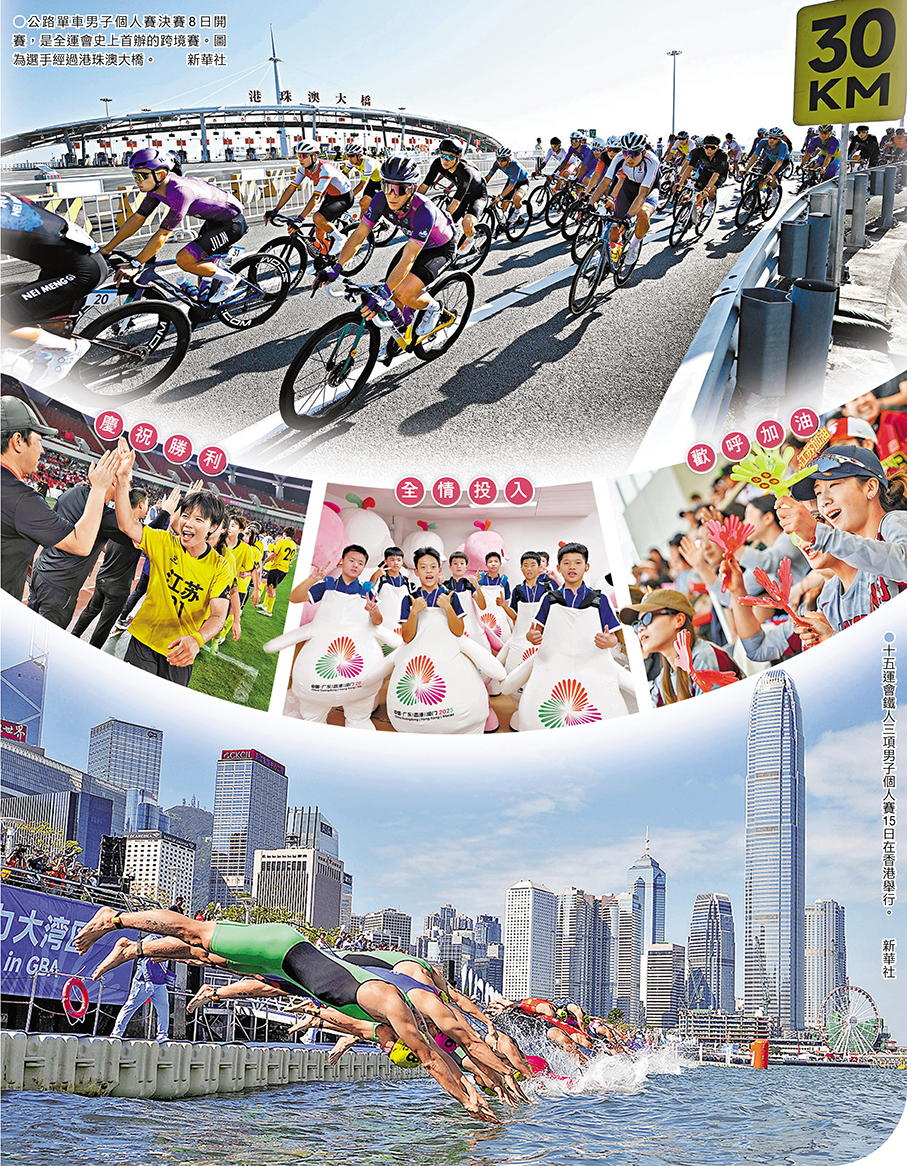 19城、1.4萬多名運動員、近萬場賽事,中國最大規模、最高水平的綜合性運動會在開放程度最高、經濟活力最強的區域之一——粵港澳大灣區圓滿落下帷幕。13天來,香港文匯報記者穿梭三地,捕捉競技體育的拚搏瞬間,見證三地協同的探索創新。在運動員的賽後訪問中,在志願者的溫暖分享中,在觀眾的打氣加油中,我們收到了對協同辦賽的點讚,對融合探索的肯定,更多的,是對大灣區未來的憧憬。