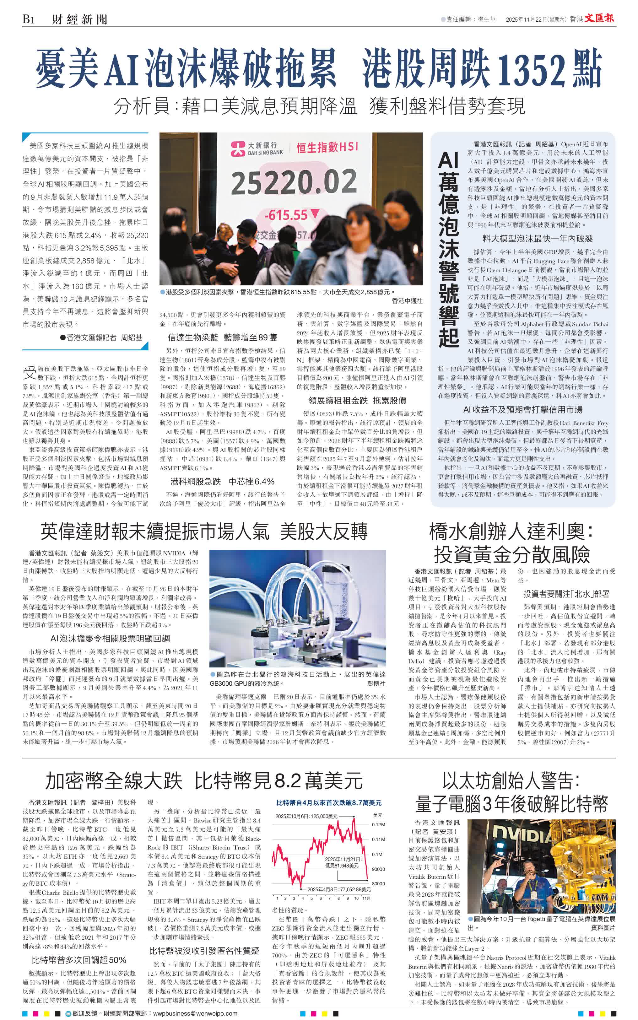 香港文匯報訊(記者 周紹基)美國多家科技巨頭圍繞AI推出總規模達數萬億美元的資本開支,被指是「非理性」繁榮,在投資者一片質疑聲中,全球AI相關股明顯回調。加上美國公布的9月非農就業人數增加11.9萬人超預期,令市場猜測美聯儲的減息步伐或會放緩,隔晚美股先升後急挫,拖累昨日港股大跌615點或2.4%,收報25,220點,科指更急瀉3.2%報5,395點。主板連創業板總成交2,858億元,「北水」淨流入銳減至約1億元,而周四「北水」淨流入為160億元。市場人士認為,美聯儲10月議息紀錄顯示,多名官員支持今年不再減息,這將會壓抑新興市場的股市表現。