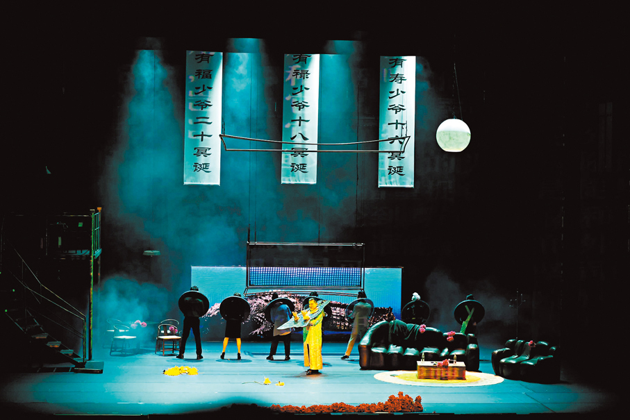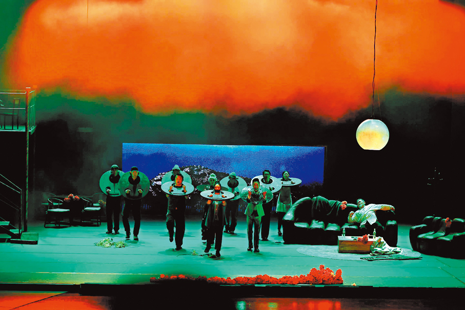 該劇舞台設計以一桌二椅為核心,配合側面的旋轉樓梯,簡潔而不乏象徵意味。開場時演員自觀眾席間現身後再走向舞台,拉近與觀眾的距離;多媒體影像則擴展了敘事空間,例如提及青雲大橋時,幕布投影即時呈現橋的影像。劇中象徵慾望的「鱷魚」亦以投影呈現,並以動作呼應劇情,使舞台在寫實與魔幻之間自然切換,將莫言筆下荒誕而尖銳的世界具象化。此外,莫言提到劇中音樂在塑造氣氛上有關鍵作用。他笑言自己「不懂音樂」,但仍明顯感受到音效與「鱷魚」之間的緊密配合:「一旦鱷魚要出現,這個音樂就會變得突然,讓人感覺到心頭、耳朵邊『一震』。」他認為音樂雖然在話劇中地位不如歌劇那麼重要,但仍能「對刻畫人物的內心起到很好的烘托作用」。