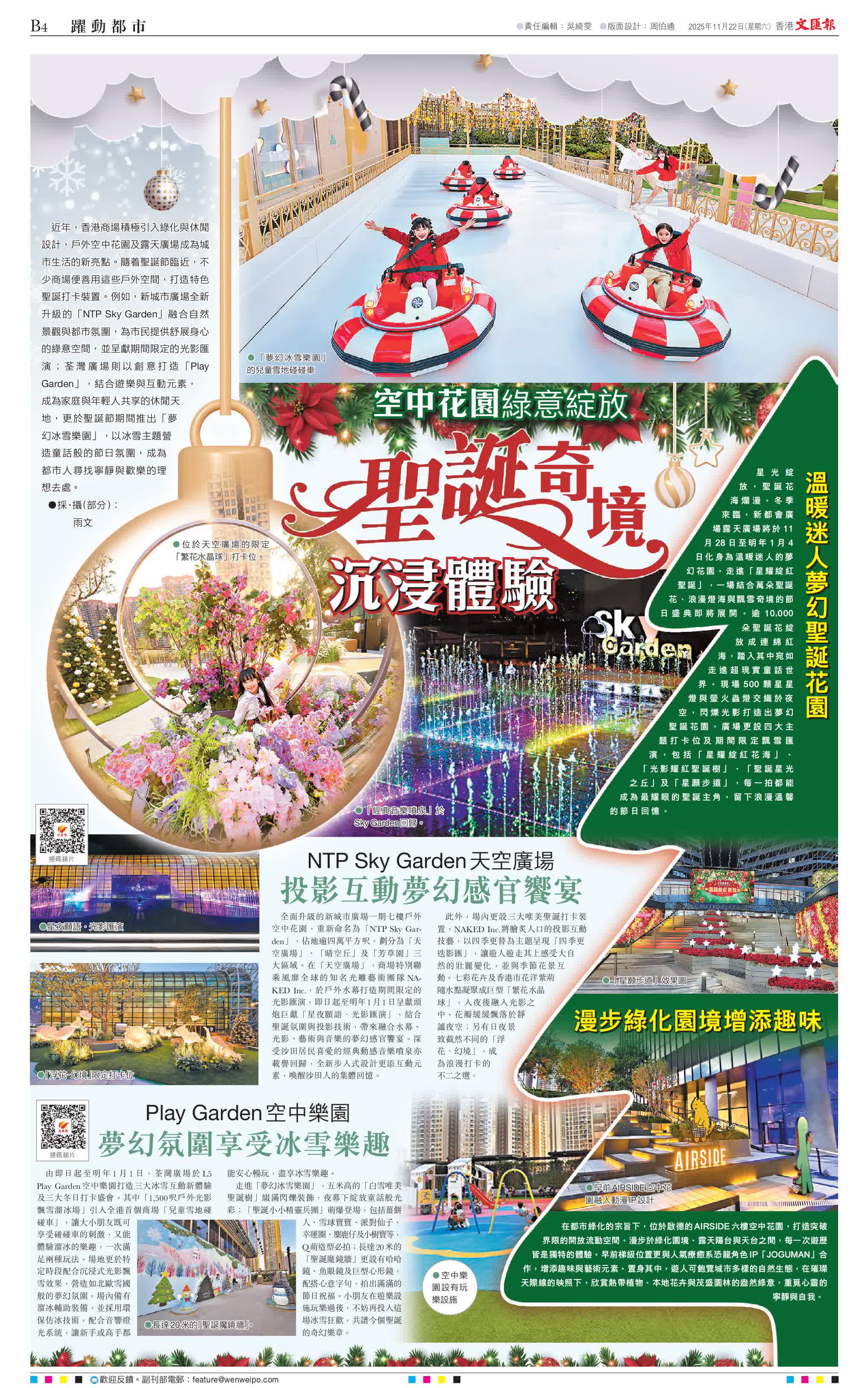 香港文匯報訊(記者 雨文)近年,香港商場積極引入綠化與休閒設計,戶外空中花園及露天廣場成為城市生活的新亮點。隨着聖誕節臨近,不少商場便善用這些戶外空間,打造特色聖誕打卡裝置。例如,新城市廣場全新升級的「NTP Sky Garden」融合自然景觀與都市氛圍,為市民提供舒展身心的綠意空間,並呈獻期間限定的光影匯演;荃灣廣場則以創意打造「Play Garden」,結合遊樂與互動元素,成為家庭與年輕人共享的休閒天地,更於聖誕節期間推出「夢幻冰雪樂園」,以冰雪主題營造童話般的節日氛圍,成為都市人尋找寧靜與歡樂的理想去處。