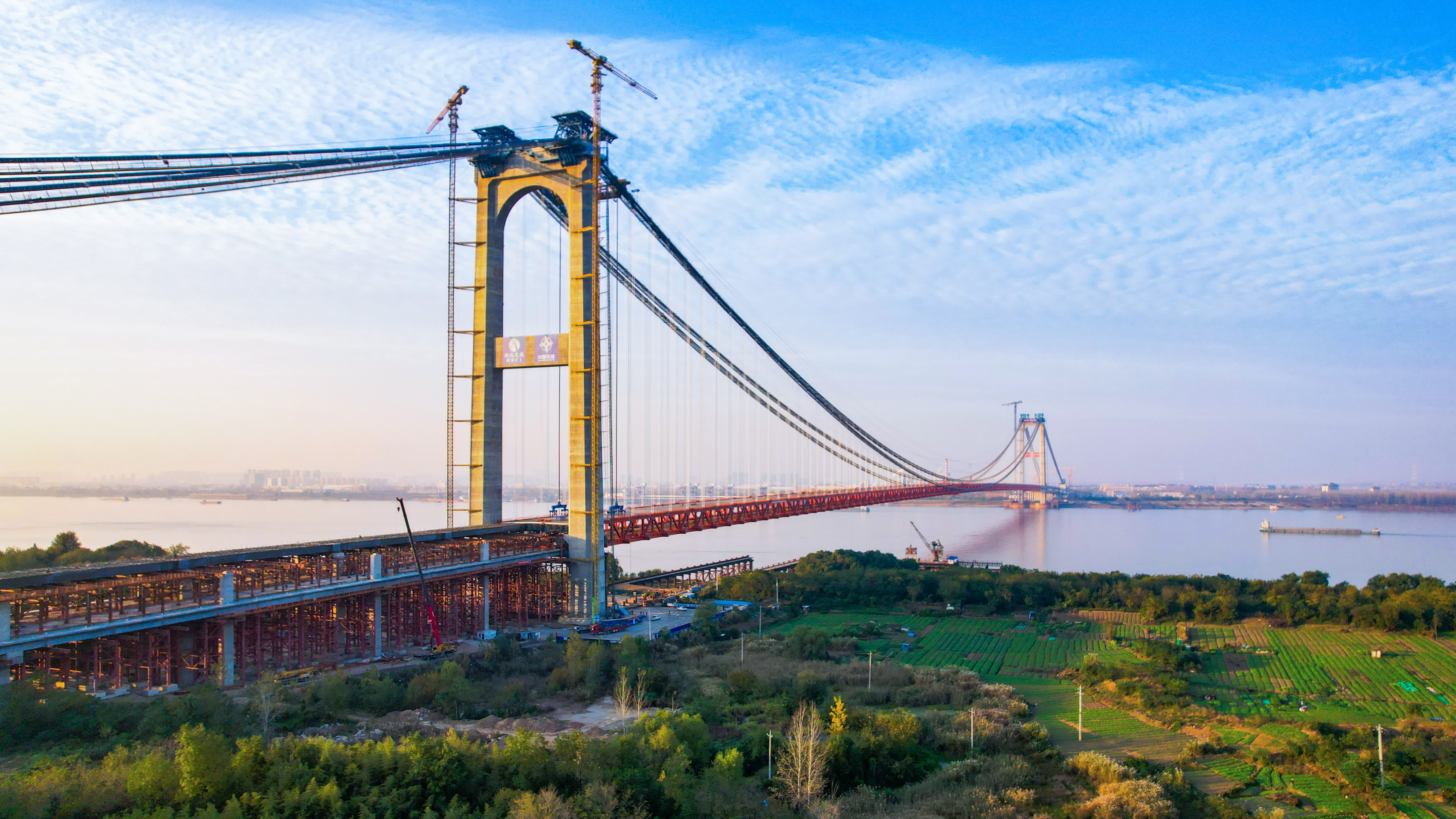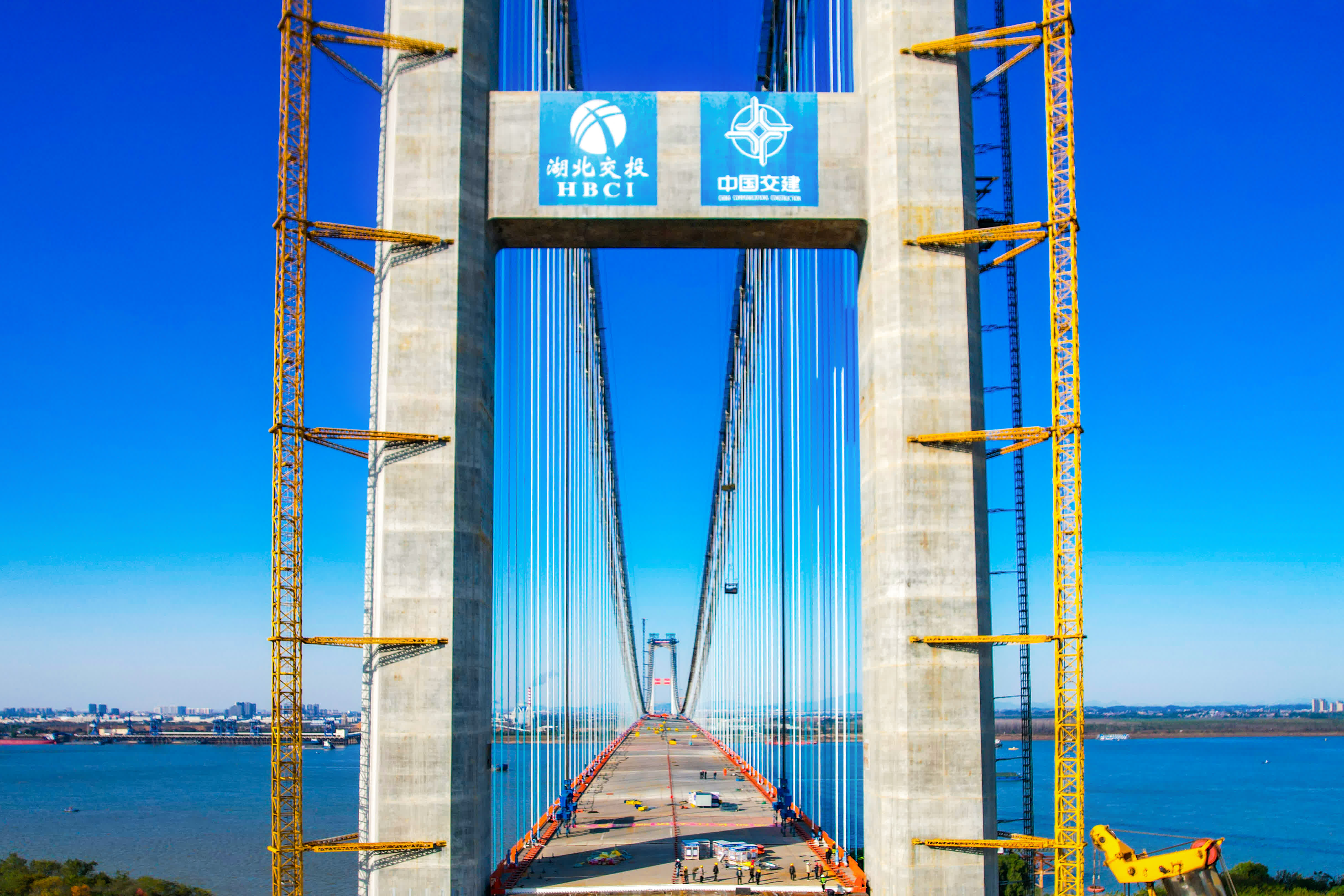 大橋由湖北交投投資、中交二航局承建,建設團隊大力推動四主纜懸索橋施工關鍵技術研究和橋樑智能化建造成套技術研究與應用——使用全國最大最強的SWD1200超級旋挖鑽,並對鉆頭進行適應性改造,破解跨地質斷裂帶大直徑群樁基礎施工難題;研發一體化智能築塔機,集成雙泵管智能布料系統、智能蒸養及振搗系統,解決超厚壁高強大體積混凝土澆築及溫控防裂難題;應用國內首個混凝土生產全過程質量監控系統——「混凝土雲工廠」,對混凝土運輸、澆築、養護全過程進行監測,從源頭保障了混凝土的澆築品質;全球首次採用等寬非對稱貓道結構體系,通過採用三跨連續式、非對稱等寬斷面、承重索穿塔的結構形式,以及使用國內強度第一的2160兆帕高強鋼絲繩及雙層受力體系,解決主纜安裝高空作業安全和穩定性問題;為大橋四主纜「量身定製」主纜架設智慧控制系統,可實現「實時監測-高效管控-自動響應」,為自動運營、輔助決策、智慧管理提供有力支持。