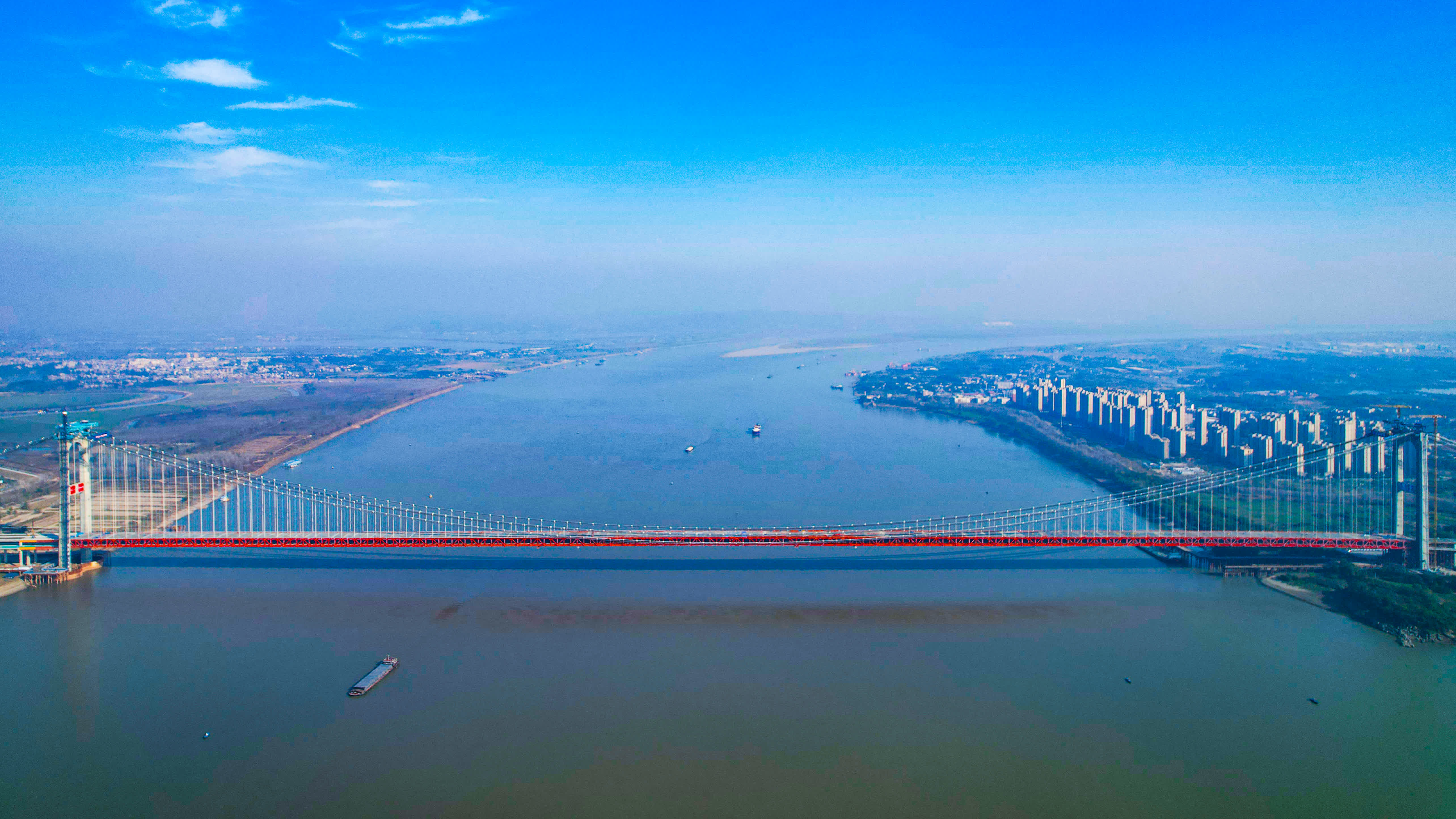 (香港文匯網記者 歐陽思柔 通訊員 葛利龍、陸落義、)11月22日,湖北省鄂州、黃岡段的長江如翠龍橫亘,江面上空,隨着最後一段巨型鋼桁樑精準吊裝到位,一跨過江、創造目前全球最大跨徑記錄的湖北燕磯長江大橋順利合龍,萬里長江再添「飛虹」。