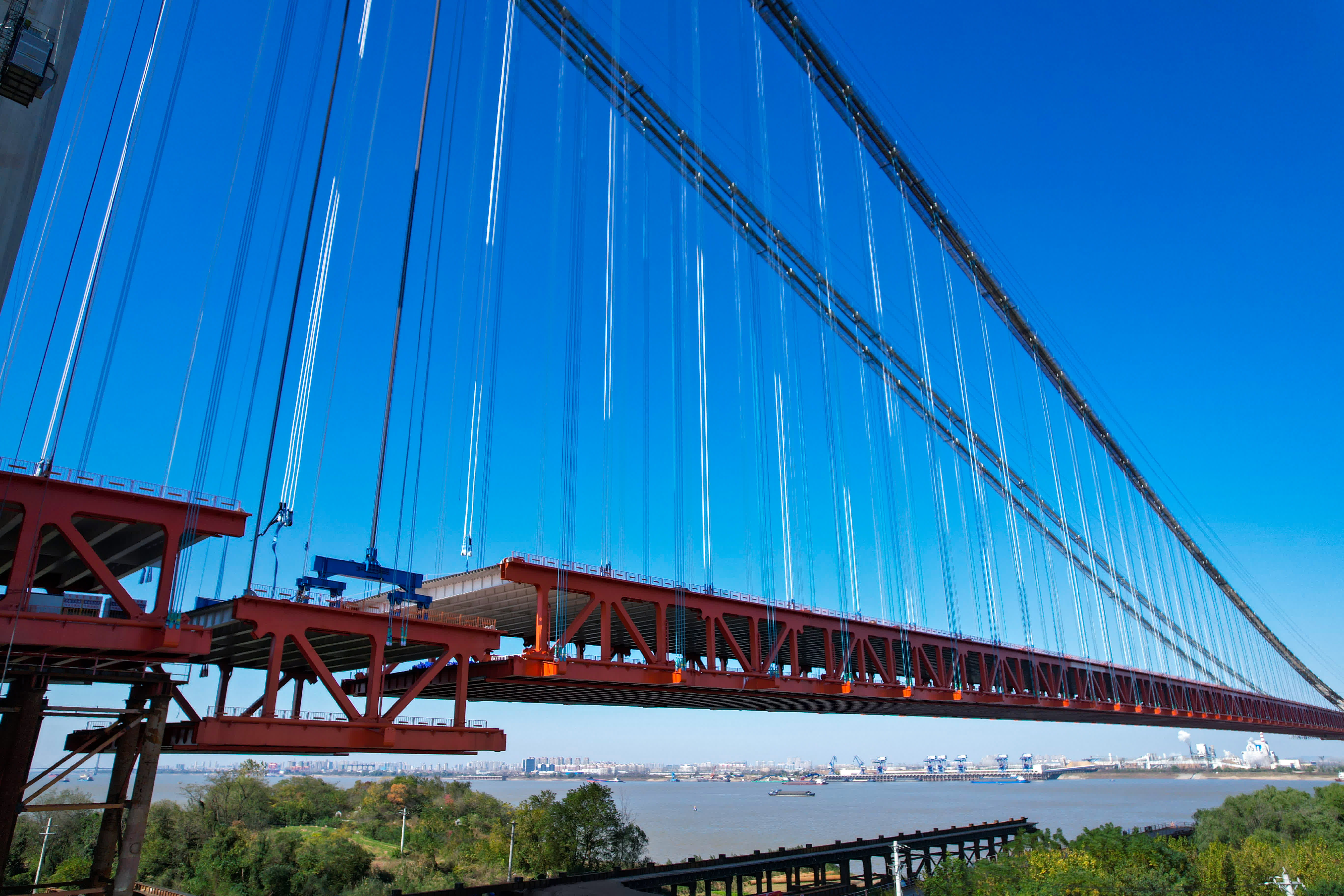 燕磯長江大橋採用不同垂度四主纜鋼桁樑雙層懸索橋設計,主跨共設有69個樑段,標準樑段長27米,寬41米,桁高9.5米,最大重量約830噸,全橋總重約5.6萬噸,相當於一艘滿載排水量的中型航母;主跨1860米,相當於6艘航母的長度。為將如此龐大的鋼桁樑吊起來,建設團隊在全橋共設置了1436根吊索,並在國內外橋樑建設中首次大規模採用全焊式索夾,共計544套,實現了索夾的輕型化、標準化製造,代表世界範圍內索夾技術最高標準。