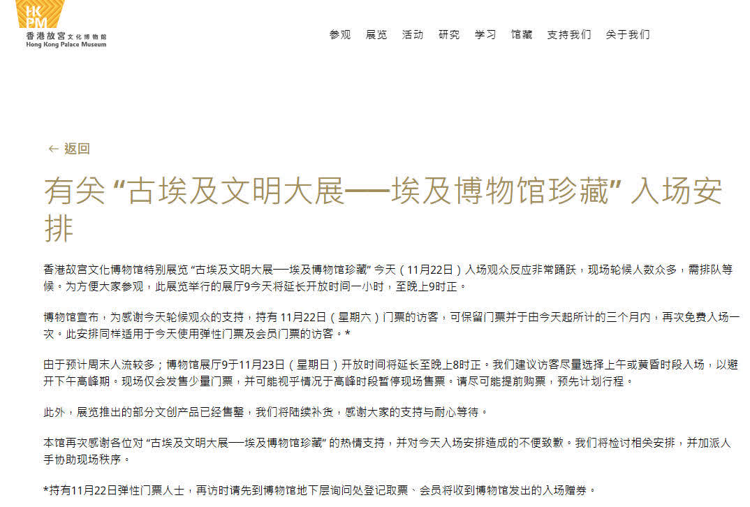 香港故宮文化博物館「古埃及文明大展──埃及博物館珍藏」於11月20日開啟,今日(22日)吸引大量遊客前來打卡,導致現場輪候人數眾多,需排隊等候。香港故宮文化博物館發言人發出通告,對展覽作出特別安排: