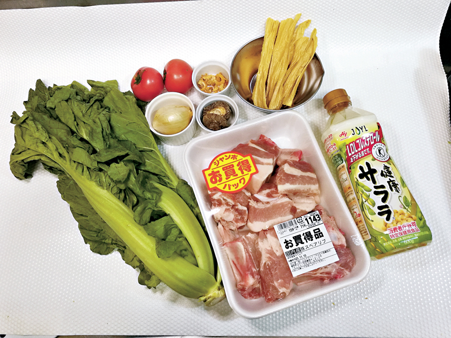 芥菜500克、番茄150克、蒜頭50克、蝦米5克、冬菇5克、排骨500克、枝竹30克、油1湯匙