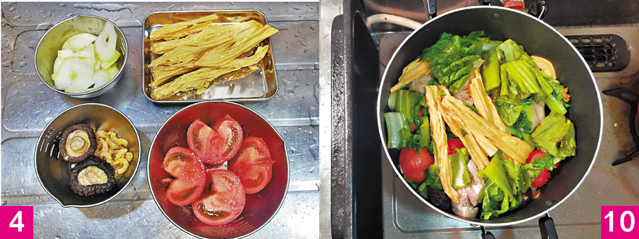 10. 加入番茄及芥菜軸拌炒均勻,再加入枝竹, 把芥菜葉放入鍋內;