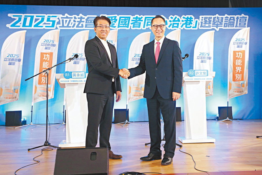 香港文匯報訊(記者 吳健怡)2025立法會「愛國者同心治港」選舉論壇功能界別工業界(第一),於昨日下午在荔枝角政府合署禮堂舉行。兩位候選人R1號黃永威和R2號許文俊各自闡述政綱,並就推動本港新型工業發展、整合大灣區的優勢及把握機遇、助力中小企利用科技轉型升級及匯聚科研人才、發展創科事業等議題發表意見。兩名候選人均來自經民聯,黃永威以「實幹興工 群策共贏」為參選口號,表示自己深知香港的獨特優勢,冀以新科技、新技術和新設計升級傳統品牌,打造「香港製造」新品牌。許文俊以「傳承工業 開創未來」為參選口號,他主張提升創新能力,推進新型工業化發展,希望借更大平台,以工業實踐力與IT創造力,為香港工業再創黃金時代。