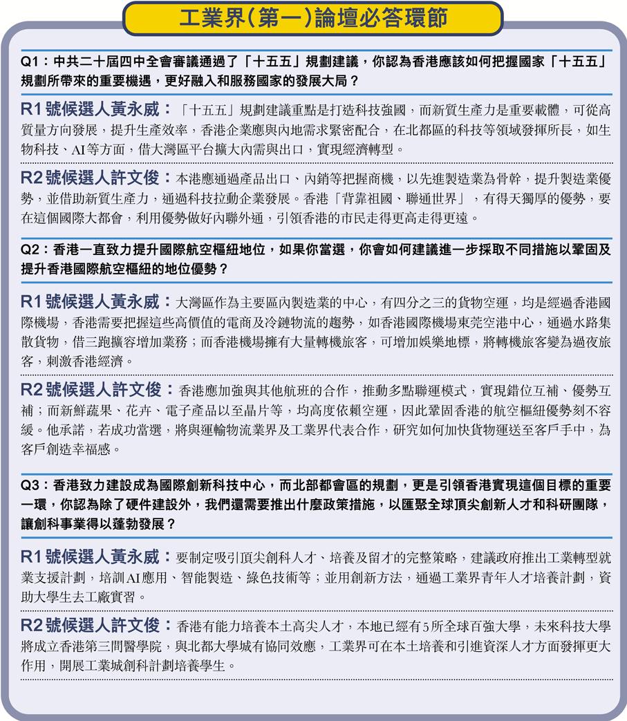 在抽籤問答環節,被問到若當選會如何實現香港工業發展未來幾年的願景,致力爭取具體成果,黃永威指應深化與內地互聯互通,並擴展至創科領域,整合兩地優勢,開發新中式產業;而北都區重點應發展生物醫藥、金融科技、AI及機械人應用等領域。對外方面,香港作為企業出海的理想平台,配合特區政府的專班,為內地企業提供一站式高端專業服務,爭取加入《區域全面經濟夥伴關係協定》,助力國家開拓新興市場。