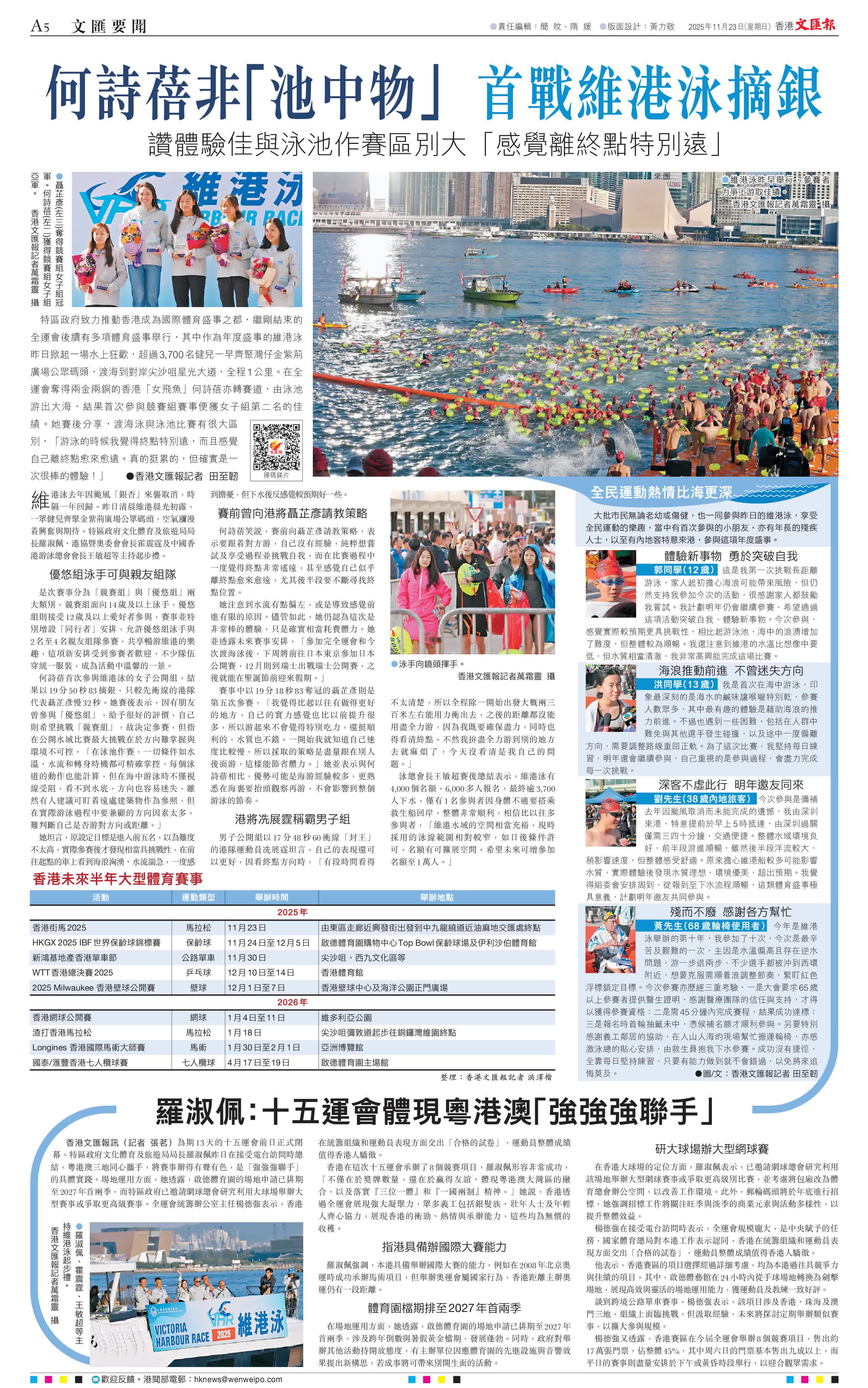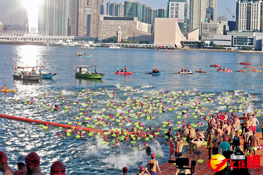 (香港文匯報記者 田至韌)特區政府致力推動香港成為國際體育盛事之都,繼剛結束的全運會後續有多項體育盛事舉行,其中作為年度盛事的維港泳昨日掀起一場水上狂歡,超過3,700名健兒一早齊聚灣仔金紫荊廣場公眾碼頭,渡海到對岸尖沙咀星光大道,全程1公里。在全運會奪得兩金兩銅的香港「女飛魚」何詩蓓亦轉賽道,由泳池游出大海,結果首次參與競賽組賽事便獲女子組第二名的佳績。她賽後分享,渡海泳與泳池比賽有很大區別,「游泳的時候我覺得終點特別遠,而且感覺自己離終點愈來愈遠。真的挺累的,但確實是一次很棒的體驗!」