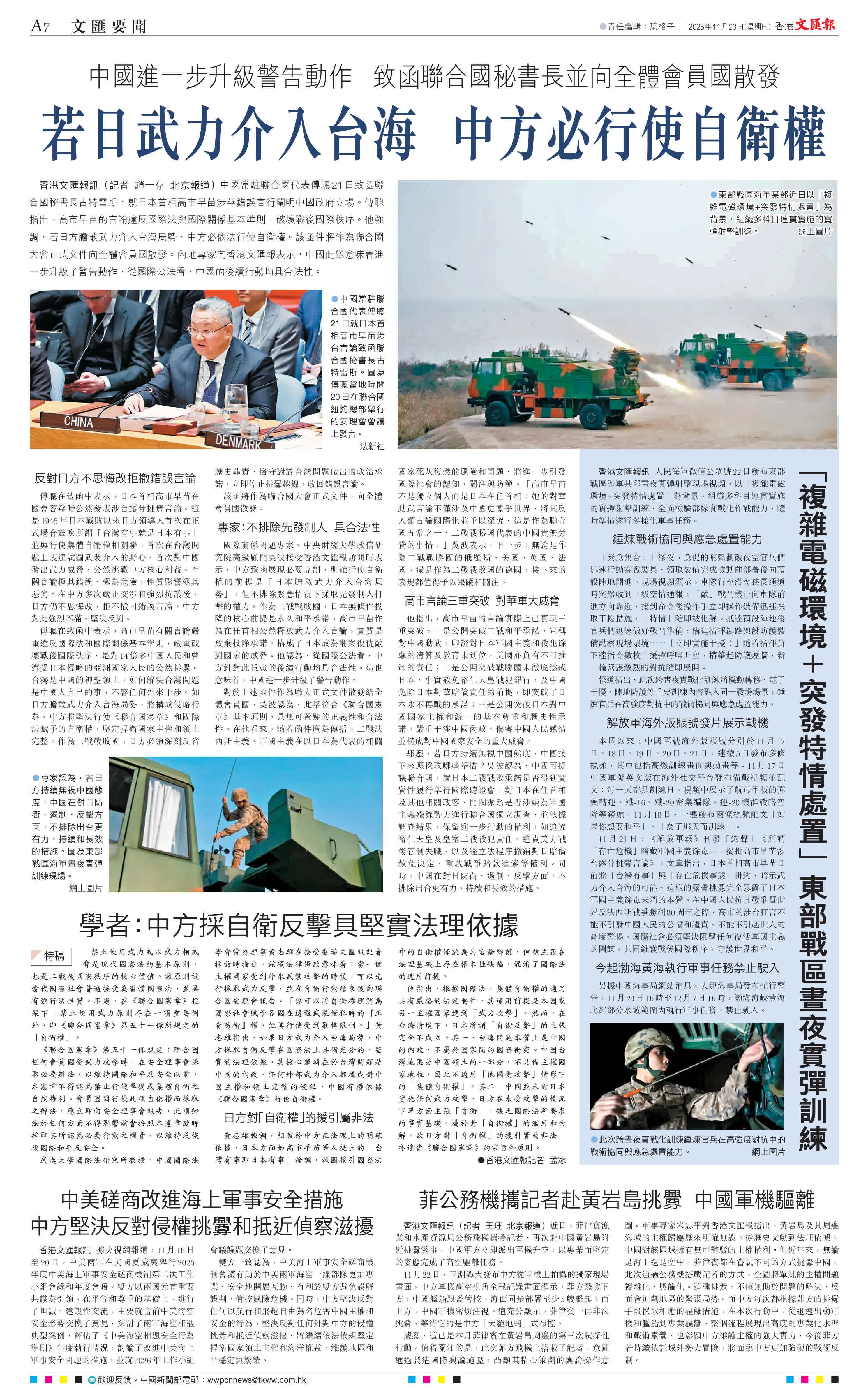 國際關係問題專家、中央財經大學政信研究院高級顧問吳波接受香港文匯報訪問時表示,中方致函展現必要克制,明確行使自衛權的前提是「日本膽敢武力介入台海局勢」,但不排除緊急情況下採取先發制人打擊的權力。作為二戰戰敗國,日本無條件投降的核心前提是永久和平承諾,高市早苗作為在任首相公然釋放武力介入言論,實質是放棄投降承諾,構成了日本成為翻案復仇敵對國家的威脅。他認為,從國際公法看,中方針對此隱患的後續行動均具合法性。這也意味着,中國進一步升級了警告動作。