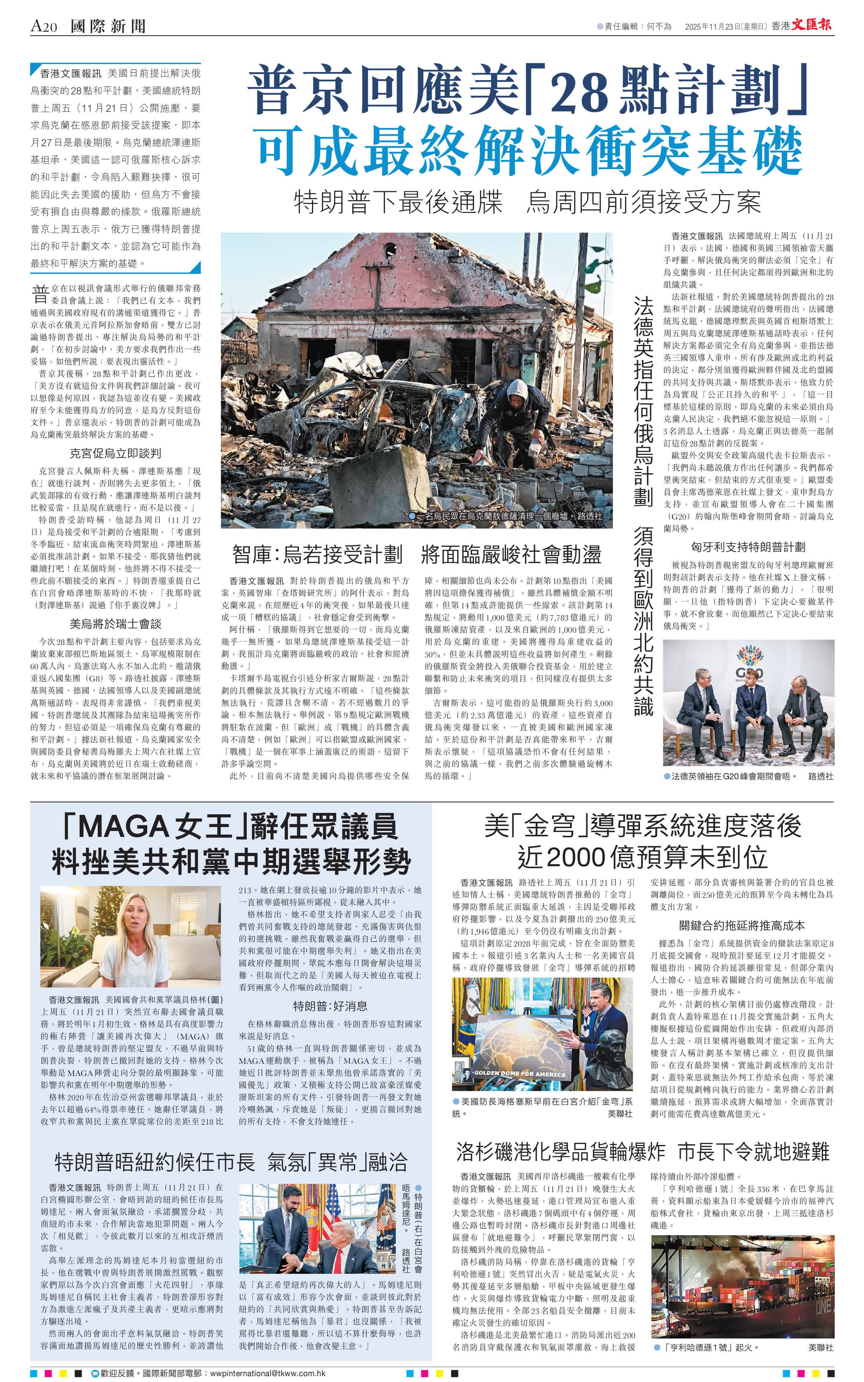 香港文匯報訊 美國日前提出解決俄烏衝突的28點和平計劃,美國總統特朗普上周五(11月21日)公開施壓,要求烏克蘭在感恩節前接受該提案,即本月27日是最後期限。烏克蘭總統澤連斯基坦承,美國這一認可俄羅斯核心訴求的和平計劃,令烏陷入艱難抉擇,很可能因此失去美國的援助,但烏方不會接受有損自由與尊嚴的條款。俄羅斯總統普京上周五表示,俄方已獲得特朗普提出的和平計劃文本,並認為它可能作為最終和平解決方案的基礎。